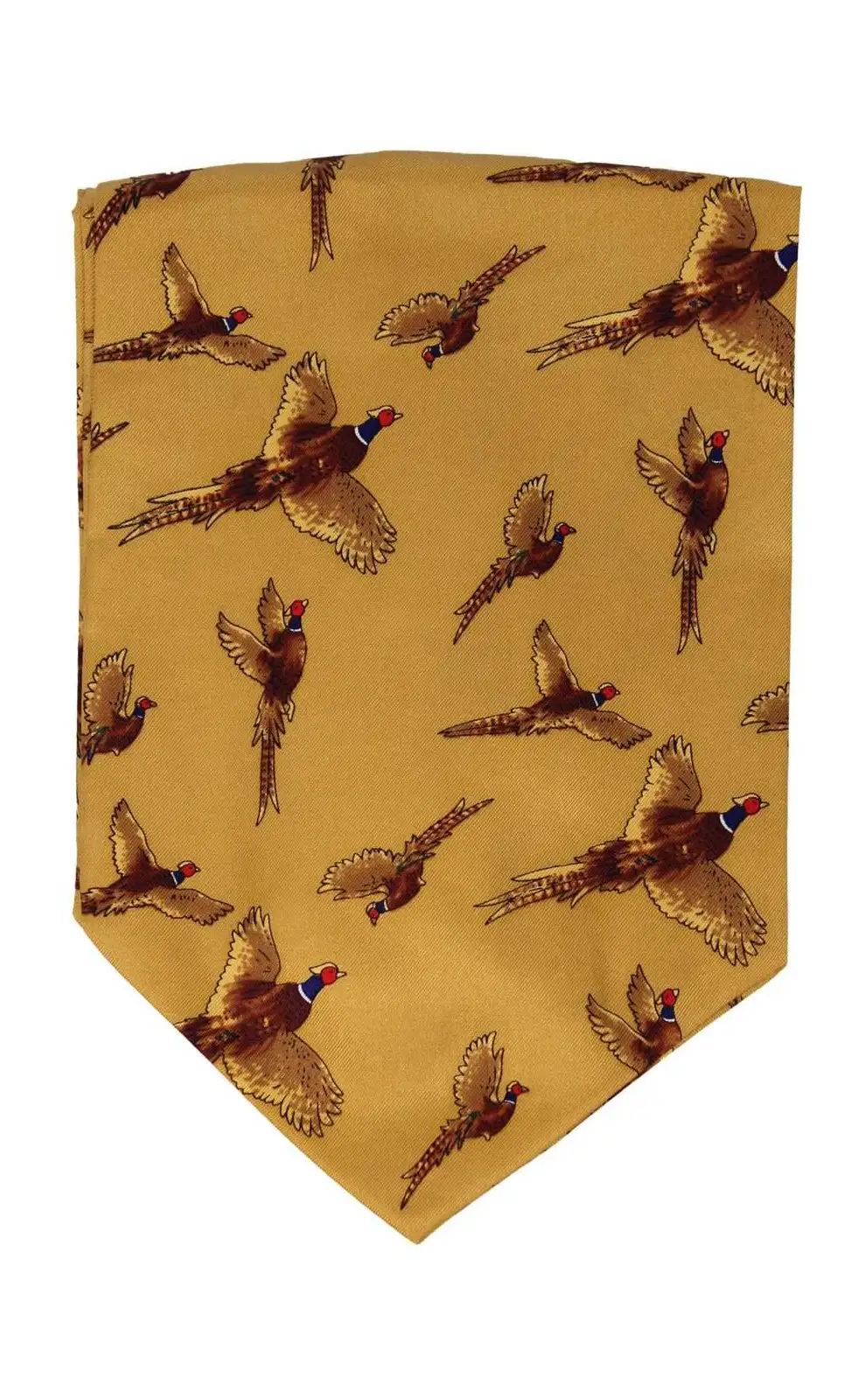 - Soprano Silk Twill Flying Pheasant Cravat On Mustard Ground