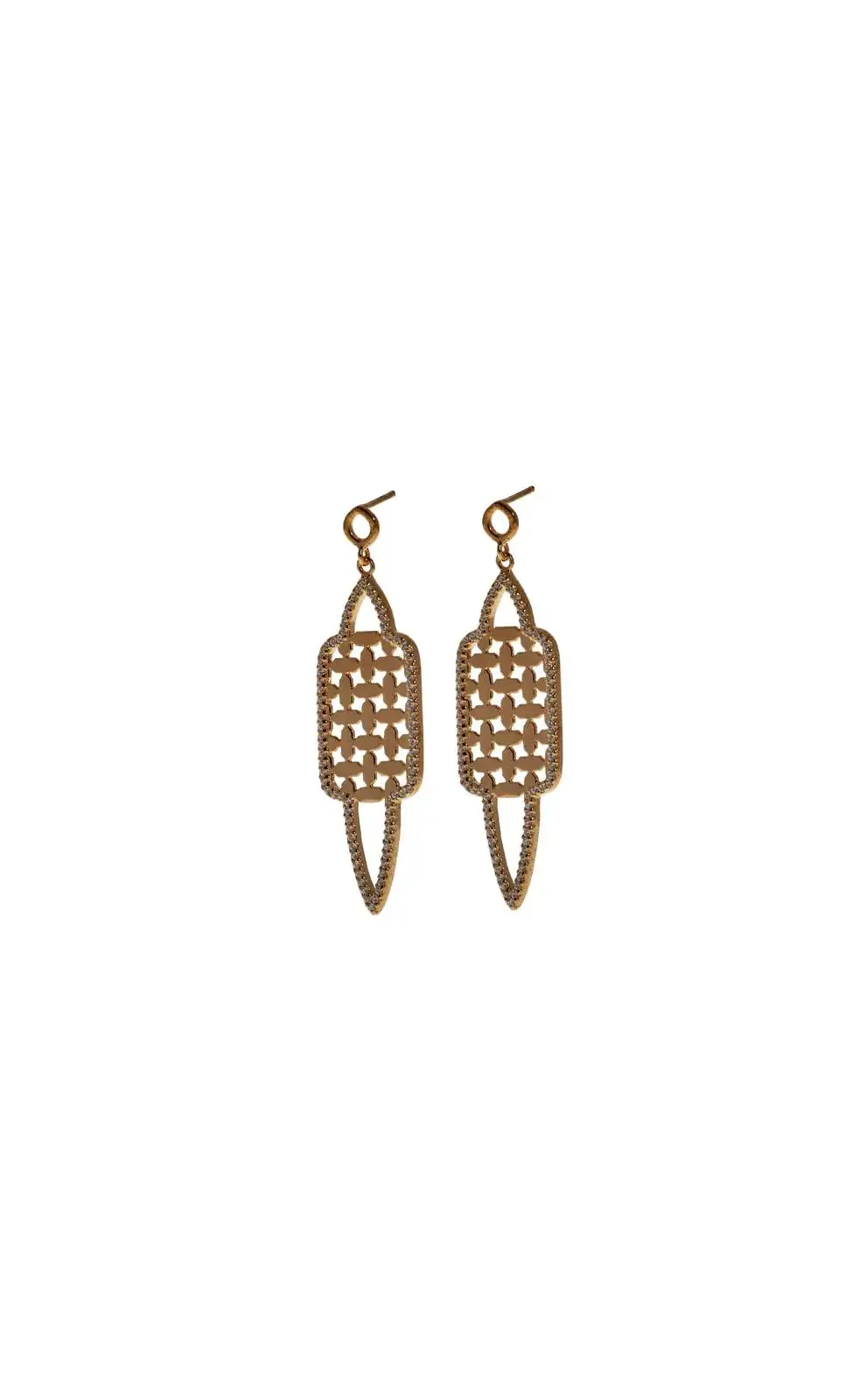 Get those heads turning with these geometrically inspired earrings. With a contour of micro pave Cubic Zirconias, keep the focus by wearing with your hair swept back or an elegant up do. Made from Sterling silver and plated with 18 carat yellow gold.