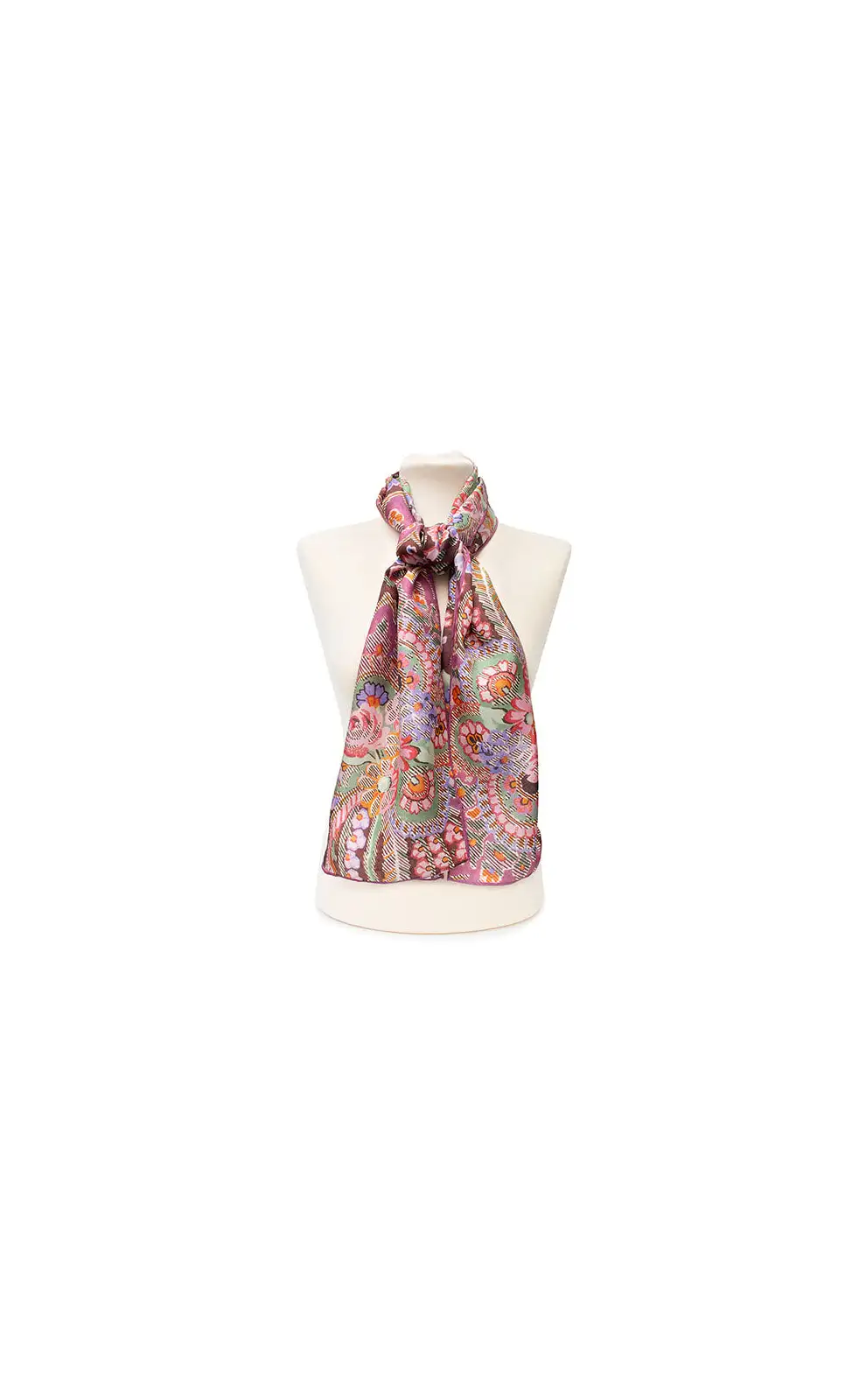 DESIGNER'S NOTES An exciting Fox & Chave silk habotai scarf in purple and plum tones with green, red, blue and gold aspects. Paisleys are a Persian ornamental motif in origin, first becoming popular in western Europe in the 18th Century. In the 1960s flower power movement, paisleys experienced a dramatic revival in Western fashion, embraced for their swirling, teardrop shapes and exotic origins that resonated with the counterculture's fascination with non Western aesthetics. Imported from India and popularised through psychedelic art and music, paisleys appeared in boldly coloured shirts, dresses, scarves, and bandanas, often rendered in vivid, clashing palettes that mirrored the era's rejection of conservative style. The motif's intricate, flowing lines complemented the bohemian spirit, becoming a visual emblem of personal freedom, cultural fusion, and the era's embrace of expressive, anti establishment ideals. COLOURS STYLING A Fox & Chave habotai silk scarf can be worn with the classic knot style or a pussycat bow. You can even create a shawl effect by knotting two scarves together behind your neck and allowing them to drape over your shoulders. More scarf styling ideas are available in this wonderful How to Tie a Scarf book. An exciting bright design on a silk habotai scarf in mainly purple and plum tones with green, red, blue and gold aspects. Paisleys are a Persian ornamental motif in origin, first becoming popular in western Europe in the 18th Century. Hand rolled hems Length: 150 cm Width: 33.5 cm Dry clean only 100% Habotai Silk Hand Rolled Hems