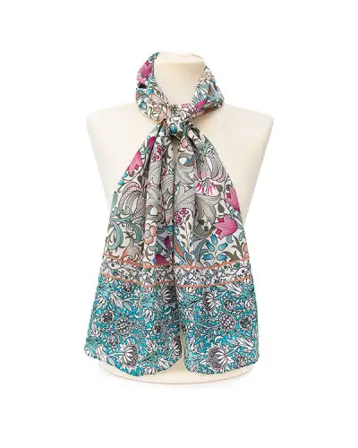 DESIGNER'S NOTES A romantic Fox & Chave chiffon silk scarf with elements from the pre-raphaelite work Laus Veneris or In Praise of Venus (1873-78) by the English painter and designer Edward Burne-Jones (1833-1898). Burne-Jones was a central figure in the later phase of the Pre-Raphaelite movement, known for his dreamlike, medieval-inspired paintings that fused romanticism with symbolism. A close associate of William Morris and a contributor to the Arts and Crafts Movement, Burne-Jones sought to revive the spiritual and aesthetic ideals of early Renaissance art. His works are marked by elongated figures, intricate patterning, and an atmosphere of languid melancholy. Laus Veneris, depicts a medievalised Queen of Love, perhaps Venus enthroned in a richly adorned interior, surrounded by maidens, isolated in sensual melancholy as knights pass by outside, symbolising love's power and its spiritual cost. The work cemented Burne-Jones's status as a master of sensual, symbolic art, influencing the Symbolist movement and redefining the Pre-Raphaelite ideal through its emotional depth and decorative intensity. COLOURS STYLING There are many ways to style a Fox & Chave chiffon silk scarf including the basic drape, belted drape and reverse drape. Our chiffon silk scarfs look really good worn in the bandit knot or faux infinity style too. More scarf styling ideas are available in this wonderful How to Tie a Scarf book. Length: 180 cm Width: 52 cm Dry clean only 100% Silk Chiffon Hand Rolled Hems