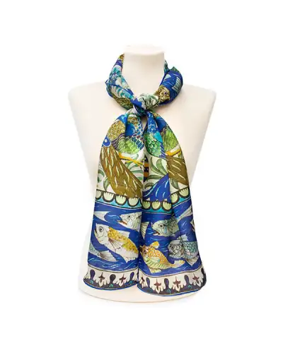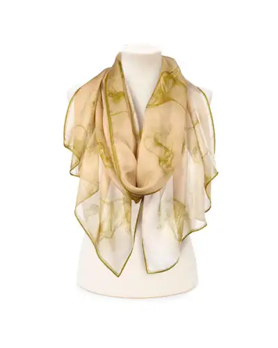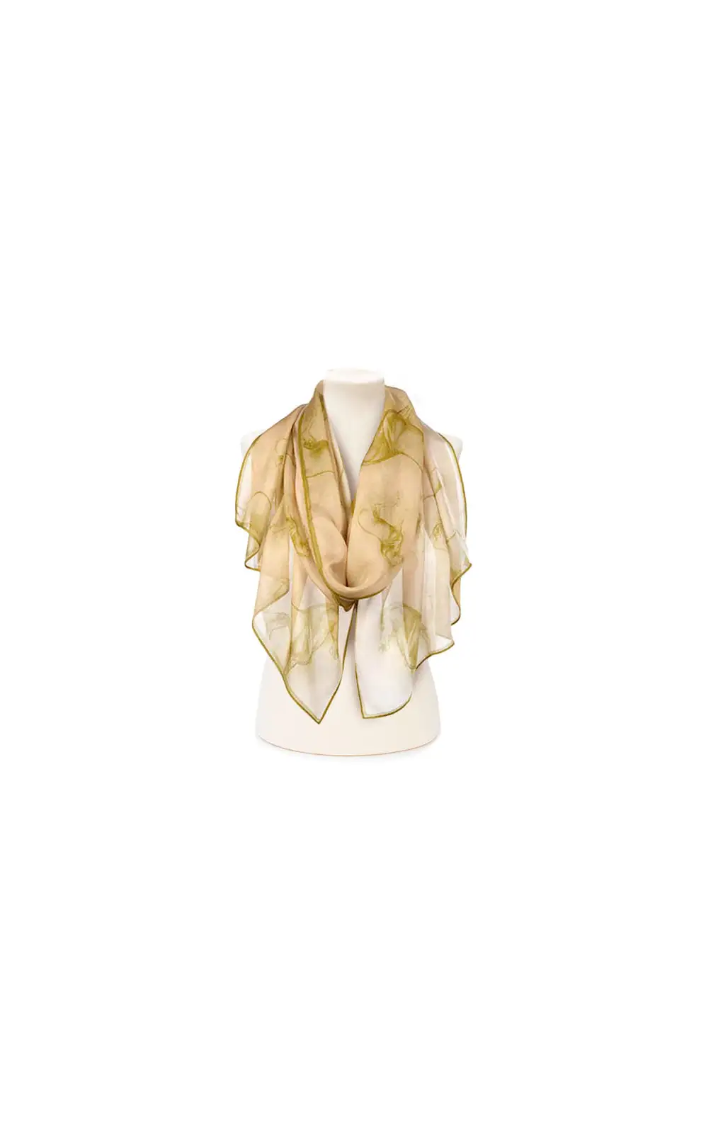 DESIGNER'S NOTES A sublime Fox & Chave silk chiffon scarf in earthy tones featuring a design of sketches by Leonardo da Vinci (1452-1519) for an unfinished equine sculpture dubbed Il Gran Cavallo. Sometimes referred to as Leonardo's Horse , or Sforza's Horse after Ludovico Sforza, the Duke of Milan who commissioned the gargantuan bronze statue in 1482. Gran Cavallo was designed to be 24 feet (7.3 meters) tall, making it the largest equestrian statue of its time. Leonardo's plans called for approximately 75 tons of bronze . However, the metal intended for the sculpture was repurposed by the Duke to make cannons to defend the city from the invasion of Charles VIII of France, so the final statue was never realised. S forza, was not only a patron of the arts but also an expert in cryptography. He employed secret codes and ciphers to communicate during his political maneuverings, reflecting the Renaissance fascination with hidden knowledge and intelligence. COLOURS STYLING There are many ways to style a Fox & Chave chiffon silk scarf including the basic drape, belted drape and reverse drape. Our chiffon silk scarfs look really good worn in the bandit knot or faux infinity style too. More scarf styling ideas are available in this wonderful How to Tie a Scarf book. Length: 180 cm Width: 52 cm Dry clean only 100% Silk Chiffon Hand Rolled Hems