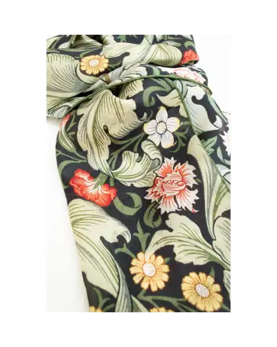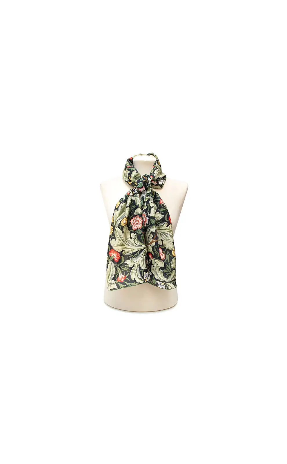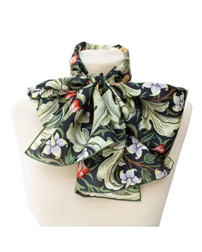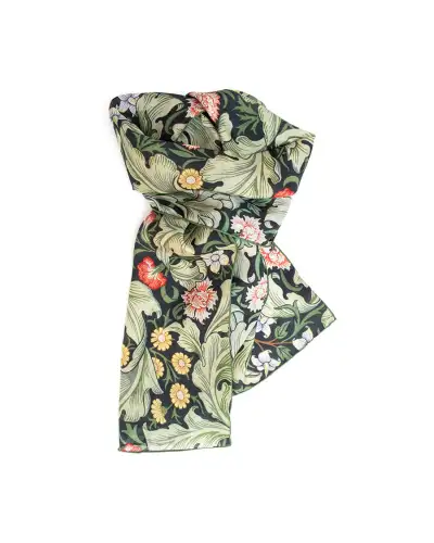 DESIGNER'S NOTES A rich Fox & Chave silk habotai scarf based on a design created in 1912 on behalf of Morris & Co. by John Henry Dearle (1859-1932) The 1912 Leicester pattern, designed by John Henry Dearle for Morris & Co., exemplifies his late-career refinement of the company's floral vocabulary. Dearle arranged sinuous stems of lilies, irises and convolvulus in a dense, rhythmic composition, where each flower grows from a shared lattice of intertwining vines. Unlike earlier Morris designs, which often emphasizsed symmetrical repetition, Leicester balances variety with subtle regularity, creating movement across the textile without overwhelming the eye. Printed on cotton and linen at Merton Abbey, the pattern showcases the layering of natural pigments, producing depth and vibrancy. Its intricate detailing and restrained palette allowed it to complement Edwardian interiors, where it was used for curtains, wall coverings and upholstery, bridging decorative artistry with domestic function. COLOURS STYLING A Fox & Chave habotai silk scarf can be worn with the classic knot style or a pussycat bow. You can even create a shawl effect by knotting two scarves together behind your neck and allowing them to drape over your shoulders. More scarf styling ideas are available in this wonderful How to Tie a Scarf book. Length: 150 cm Width: 33.5 cm Dry clean only 100% Habotai Silk Hand Rolled Hems