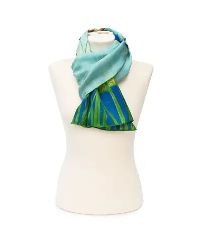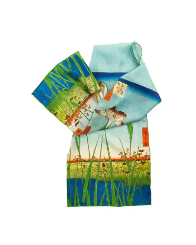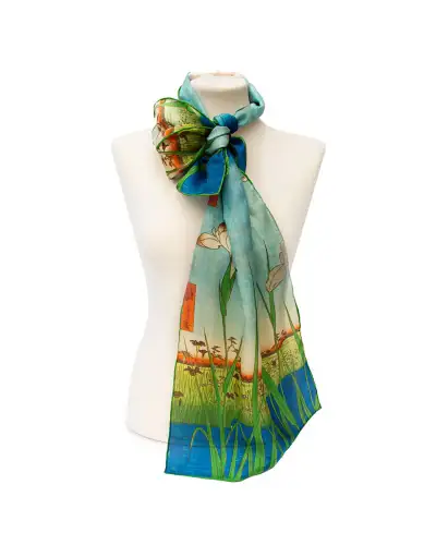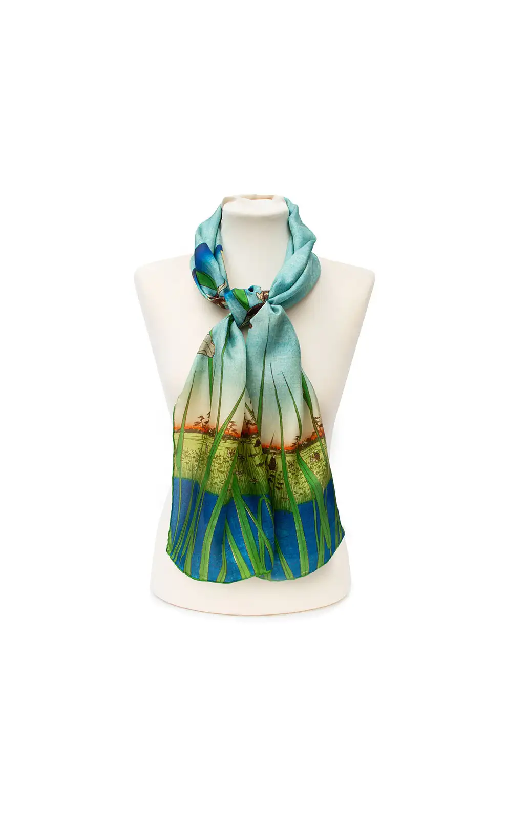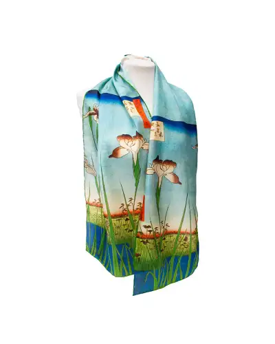 DESIGNER'S NOTES A marvellous Fox & Chave silk habotai scarf featuring a scene of rural Japan in the ukiyo-e style after an original named Horikiri no Hanashobu or Horikiri Iris Garden which is No.64 in the famous series 100 Views of Edo by the Japanese artist Uttagawa Hiroshige (1797-1858). 100 Views of Edo is segmented by seasons and this work falls under the Summer part of the series. It depicts large blooming Iris flowers in the foreground on the near side of a river or stream. On the far side are more blooms of same and a depiction of several figures in a grassy meadow beyond. It is unclear if they are tending the land or at leisure. The largest portion of the work is an expansive blue sky that meets the horizon with a dark orange indicating the waning sun of the later summer. COLOURS STYLING A Fox & Chave habotai silk scarf can be worn with the classic knot style or a pussycat bow. You can even create a shawl effect by knotting two scarves together behind your neck and allowing them to drape over your shoulders. More scarf styling ideas are available in this wonderful How to Tie a Scarf book. Length: 150 cm Width: 33.5 cm Dry clean only 100% Habotai Silk