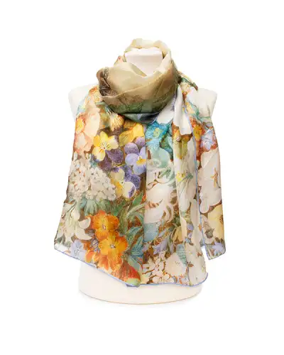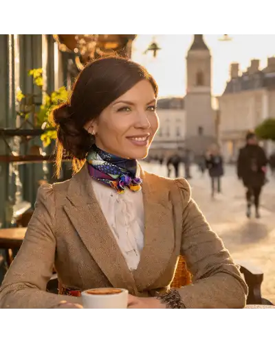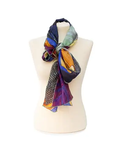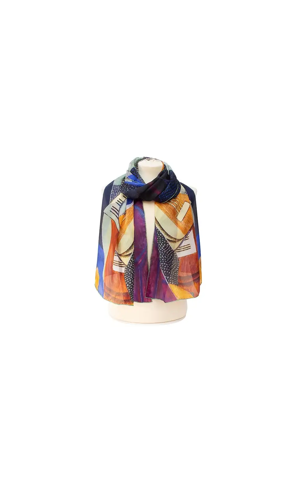 DESIGNER'S NOTES This vibrant Fox & Chave silk habotai scarf offers a faithful representation of the dynamism of both colour and form present in the cubist work Guitar on a Table (1916) by Juan Gris. Juan Gris was a prominent figure in the Cubist movement, revolutionising modern art with his geometric and abstract compositions. Born José Victoriano González-Pérez in 1887 in Madrid, Spain, Gris moved to Paris and became associated with artists like Picasso and Braque. Cubism sought to shatter both traditions and subjects with its characteristic fragmented forms, geometric shapes, and multiple perspectives, intended to depict objects from multiple viewpoints simultaneously. Gris's works exhibit a meticulous attention to detail, employing fragmented forms and vibrant colours to convey depth and dimension. His unique style fused analytical Cubism with elements of Synthetic Cubism, creating harmonious compositions that challenged traditional notions of representation. COLOURS STYLING A Fox & Chave habotai silk scarf can be worn with the classic knot style or a pussycat bow. You can even create a shawl effect by knotting two scarves together behind your neck and allowing them to drape over your shoulders. More scarf styling ideas are available in this wonderful How to Tie a Scarf book. Length: 180 cm Width: 52 cm Dry clean only 100% Habotai Silk Hand Rolled Hems