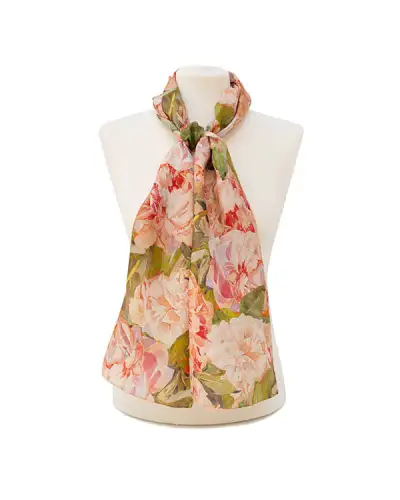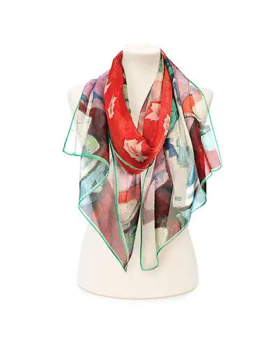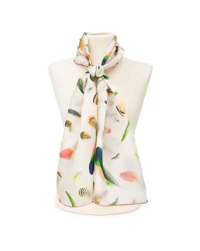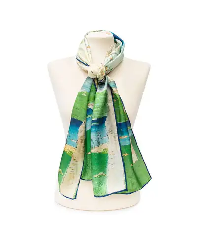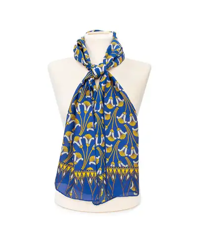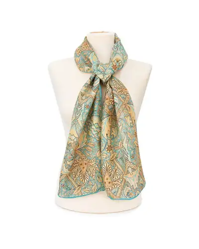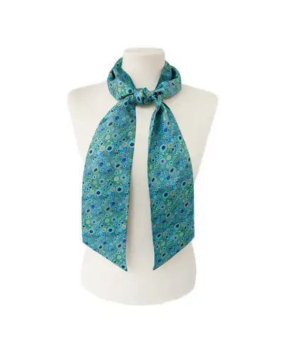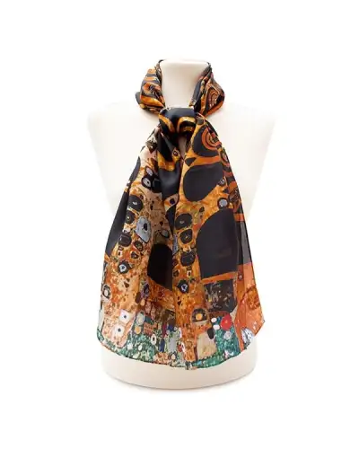 DESIGNER'S NOTES A charming Fox & Chave silk habotai scarf with a design featuring an element from the Stoclet Frieze, commissioned by the financier Adolphe Stoclet and his wife Suzanne for their home the Stoclet Palace in Brussels, Belgium and undertaken by Gustav Klimt (1862-1918). The frieze is a mosaic in three parts, the expectation , the knight , and the embrace that compose a visual narrative of the reuniting of a couple. Each panel features the central motif of a sprawling tree of life, rich in golds, deep blues, and vibrant reds, contributing to its opulent and otherworldly atmosphere. COLOURS STYLING A Fox & Chave habotai silk scarf can be worn with the classic knot style or a pussycat bow. You can even create a shawl effect by knotting two scarves together behind your neck and allowing them to drape over your shoulders. More scarf styling ideas are available in this wonderful How to Tie a Scarf book. Length: 150 cm Width: 33.5 cm Dry clean only 100% Habotai Silk Hand Rolled Hems