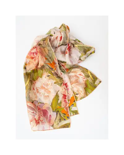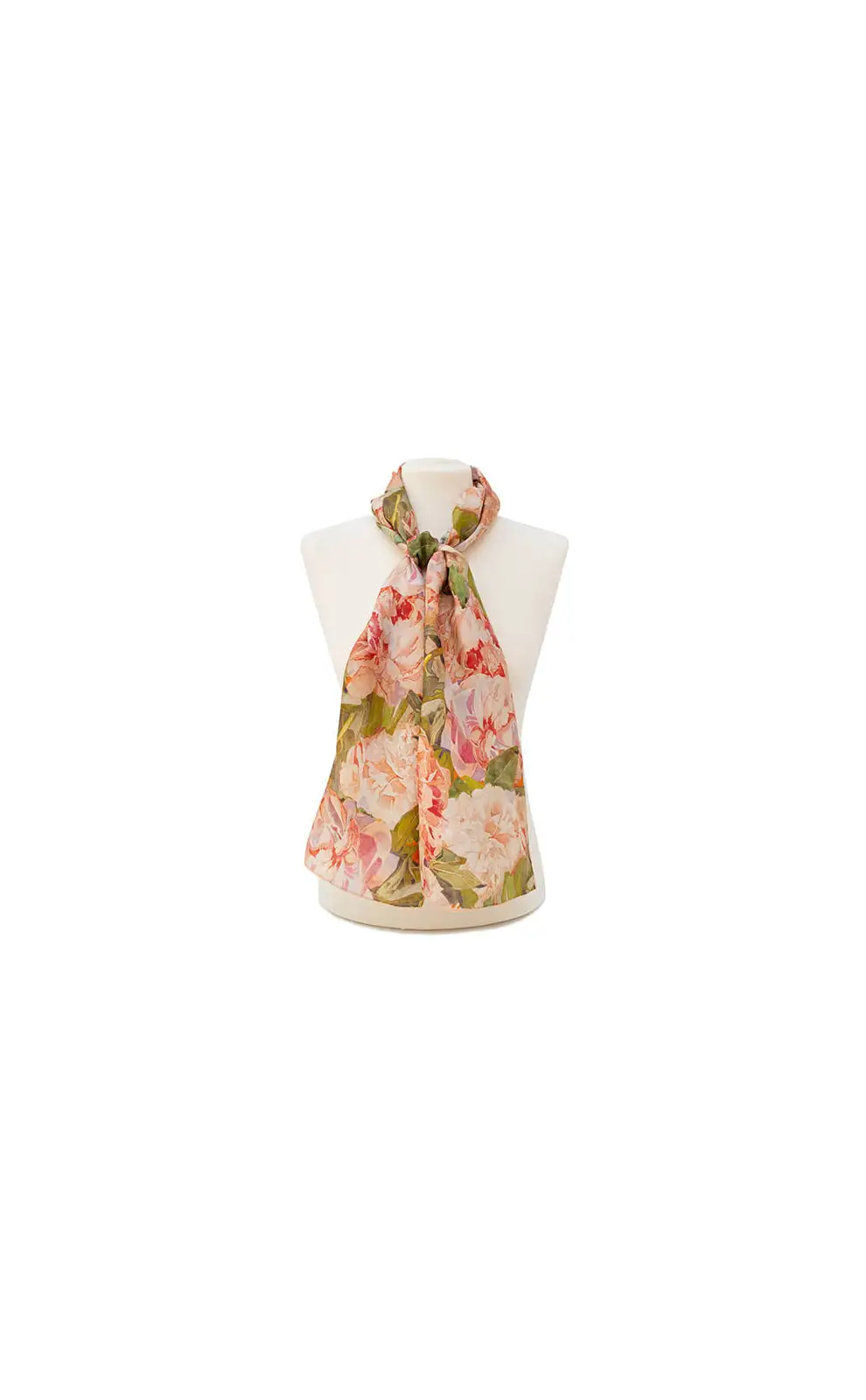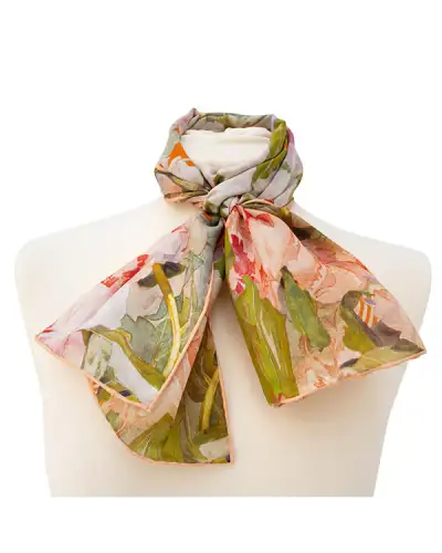 DESIGNER'S NOTES A Fox & Chave silk habotai scarf in shades of pink from a study in watercolours by Charles Rennie Mackintosh (1868-1928) entitled simply Peonies (1920). Mackintosh was living in London at the time of its painting, from 1914 to 1923, a challenging and transitional period in his life, he had left Glasgow due to declining commissions and professional setbacks, and sought new opportunities in the capital. During this time, he shifted his focus from architecture to textile design and watercolours, creating patterns for companies like Foxton's and William Foxton Ltd. At this time he made a speculative foray into designing modernist buildings, which he hoped would revitalise his career. Unfortunately, these projects remained unrealised, as his innovative style was seen as out of step with contemporary trends. Financial struggles and poor health plagued him, but his London watercolours—evocative and experimental—revealed his enduring artistic creativity. These years marked the end of his major design work before his retreat to the south of France. COLOURS STYLING A Fox & Chave habotai silk scarf can be worn with the classic knot style or a pussycat bow. You can even create a shawl effect by knotting two scarves together behind your neck and allowing them to drape over your shoulders. More scarf styling ideas are available in this wonderful How to Tie a Scarf book.