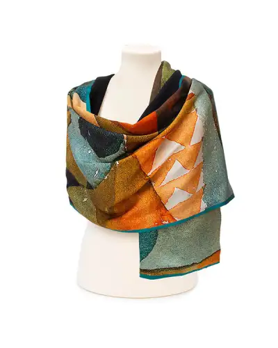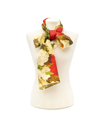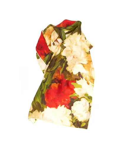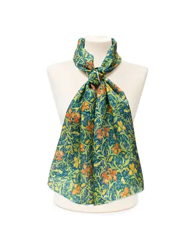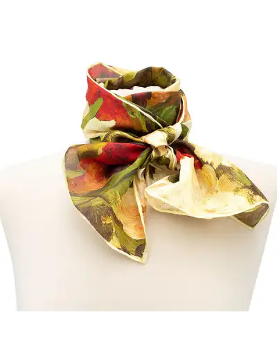 DESIGNER'S NOTES A glorious Fox & Chave silk habotai scarf featuring elements from the work Vase de Pivoines sur Piedouche or Vase of Peonies on a Small Pedastal (1864) by Éduoard Manet (1832-1883). Manet's still life paintings, though less celebrated than his provocative figure works, reveal a quieter, more contemplative side of his artistry. While his famous subjects such as Olympia (1863) or Le Déjeuner sur l'herbe (1862-63) shocked viewers with their modernity and challenged social norms, his still life works focus instead on precision, light, and texture. In contrast to the confrontational gazes and complex narratives of his figure paintings, these intimate images, often depicting flowers, fruit, or objects on a table, display remarkable technical control and sensitivity. They invite subtle appreciation, and reflect his admiration for the Spanish masters and Dutch realism offering an insight into his ability to elevate everyday objects into scenes of beauty, mortality, and transience. COLOURS STYLING A Fox & Chave habotai silk scarf can be worn with the classic knot style or a pussycat bow. You can even create a shawl effect by knotting two scarves together behind your neck and allowing them to drape over your shoulders. More scarf styling ideas are available in this wonderful How to Tie a Scarf book. Length: 150 cm Width: 33.5 cm Dry clean only 100% Habotai Silk Hand Rolled Hems