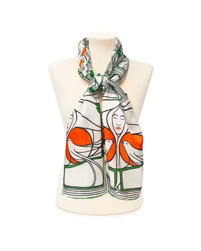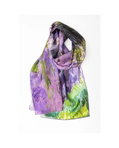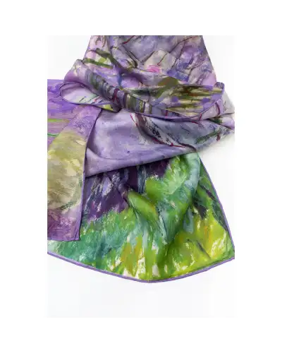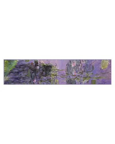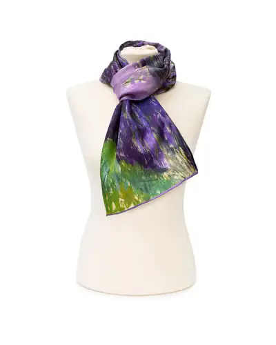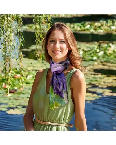 DESIGNER'S NOTES A purple, lilac and green Fox & Chave silk habotai scarf featuring an element of one of more than two hundred paintings in the Waterlilies series by Claude Monet (1840-1926). This one was painted between 1916 and 1919. Monet began the series of paintings of Waterlilies, or Nympheas, in 1897 and continued to add to it for the best part of the next 30 years, right up until his death. Some of the early images feature the famous Japanese style bridge that spanned a part of the pond in his garden at Giverny, but the majority focus only on the play of changing light conditions upon the water and the floating flora, giving rise to the wide variety of colours that can be seen across the series. COLOURS STYLING A Fox & Chave habotai silk scarf can be worn with the classic knot style or a pussycat bow. You can even create a shawl effect by knotting two scarves together behind your neck and allowing them to drape over your shoulders. More scarf styling ideas are available in this wonderful How to Tie a Scarf book. Length: 150 cm Width: 33.5 cm Dry clean only 100% Habotai Silk Hand Rolled Hems