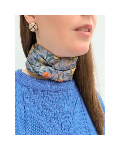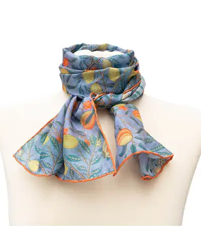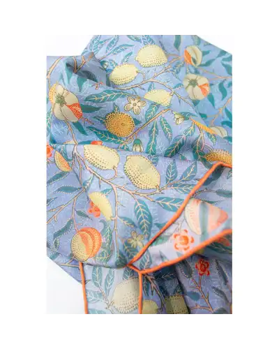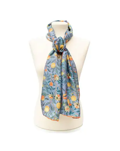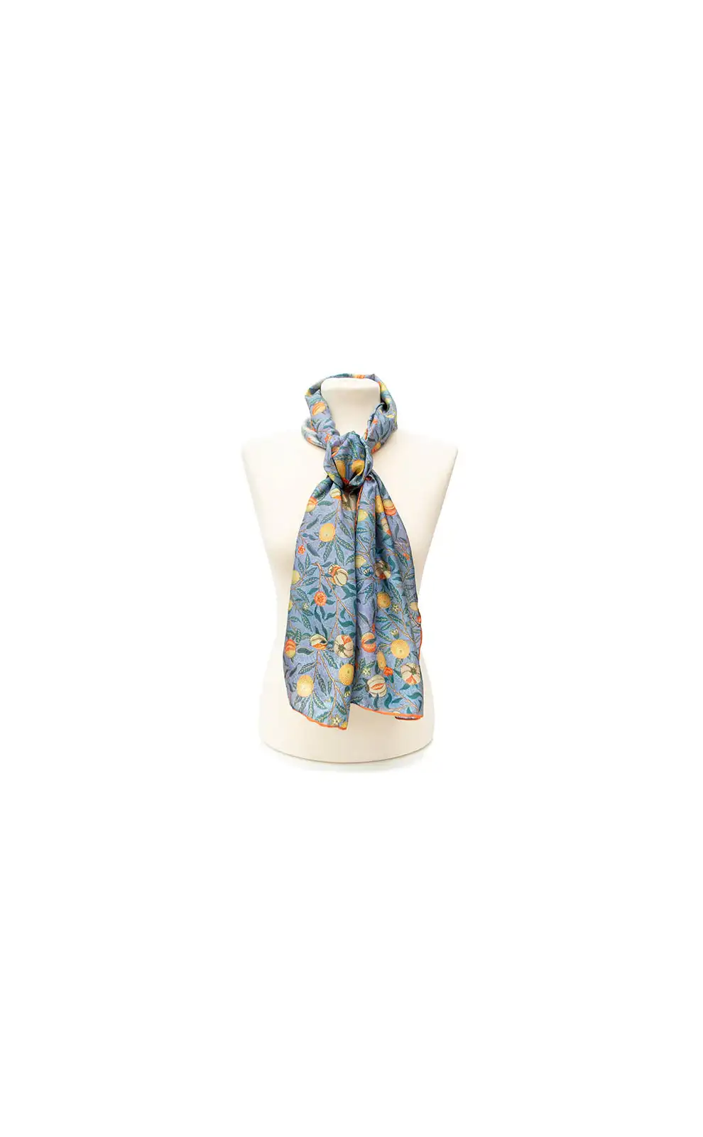 DESIGNER'S NOTES This colourful Fox & Chave silk habotai scarf features pomegranates hanging from the branches of an overflowing tree amongst flora and fauna, printed over fine branches, and a blue ground One of the earliest wallpaper designs by the Morris Company in 1864, the Fruit pattern showcases pomegranates as both botanical subjects and symbolic motifs, arranged within a complex network of curling stems and stylised leaves. Unlike his later, denser compositions, Fruit demonstrates a careful balance between individual fruits and the surrounding foliage, allowing each element to be appreciated for form and colour. The pomegranate, with its jewel-like seeds, is depicted in rich reds and ochres, contrasting with deep green leaves that twist in rhythmic arcs. Morris was inspired by a combination of medieval manuscripts, Italian Renaissance ornament, and Persian textiles, integrating these influences into a distinctly English decorative vocabulary. The design conveys vitality through movement while retaining the ordered elegance characteristic of his early work. COLOURS STYLING A Fox & Chave habotai silk scarf can be worn with the classic knot style or a pussycat bow. You can even create a shawl effect by knotting two scarves together behind your neck and allowing them to drape over your shoulders. More scarf styling ideas are available in this wonderful How to Tie a Scarf book. Length: 150 cm Width: 33.5 cm Dry clean only 100% Habotai Silk Hand Rolled Hems