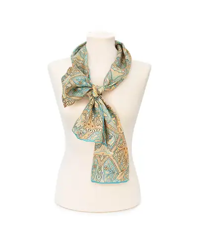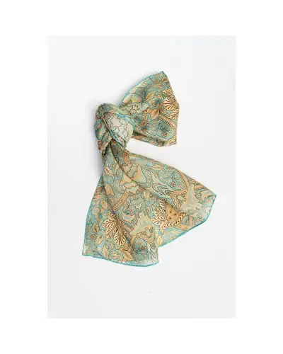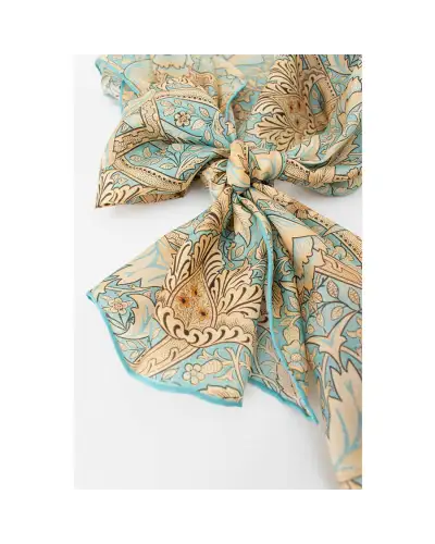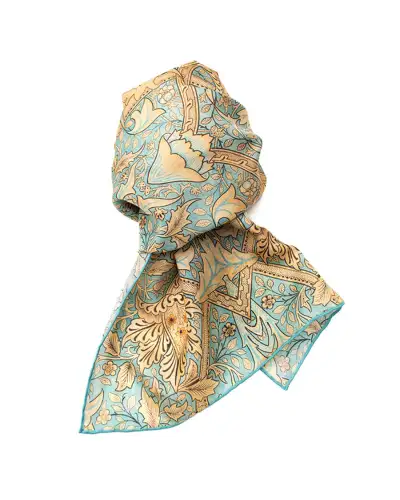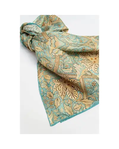 DESIGNER'S NOTES A refined Fox & Chave silk habotai scarf with a design after the pattern 'Windrush' developed originally as a pencil and watercolour sketch by William Morris in 1881 for production as a block-printed textile. One of a series of designs by Morris named after rivers in the United Kingdom. The River Windrush, is a tributary of the Thames that flows through the picturesque Cotswolds region in England. This area was a significant source of inspiration for Morris, who often drew from the English countryside for his designs. The design is characterised by its complex and flowing depiction of foliage and flowers, elements commonly found in Morris's work, showcasing his typical style of intertwining plants and natural forms. Upon it's issue, Windrush's naturalistic motifs resonated with the Victorian public, who appreciated the return to nature and artisanal quality that Morris championed. COLOURS STYLING A Fox & Chave habotai silk scarf can be worn with the classic knot style or a pussycat bow. You can even create a shawl effect by knotting two scarves together behind your neck and allowing them to drape over your shoulders. More scarf styling ideas are available in this wonderful How to Tie a Scarf book. Length: 150 cm Width: 33.5 cm Dry clean only 100% Habotai Silk Hand Rolled Hems