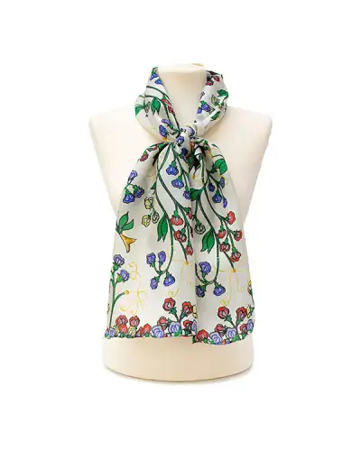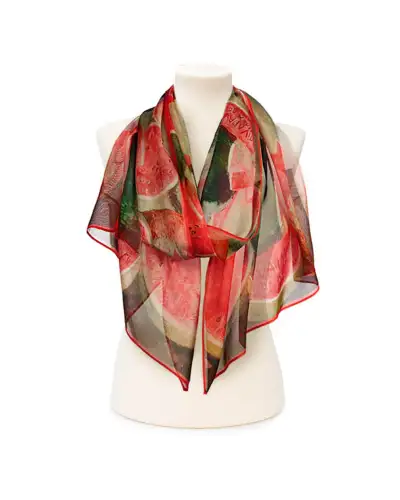 DESIGNER'S NOTES A subtle Fox & Chave silk chiffon scarf after the work by Paul Klee entitled Bewegung an der Steilküste (1929) or Movement on the Cliff. The painting captures a coastal scene with Klee's characteristic use of geometric forms and carefully balanced colours. Klee's use of geometric shapes gives the cliffs a stylised, almost mosaic-like appearance. The movement suggested in the title is conveyed through the dynamic arrangement of these shapes, as well as the play of colours that seem to vibrate and shift across the canvas. The colour palette contains blues and greens representing the sea, contrasted by the warm tones of the cliffs. Klee's signature use of delicate lines and layered, translucent colours creates a sense of depth and complexity, inviting viewers to explore the landscape not just as a physical space, but as an emotional and conceptual one. COLOURS STYLING There are many ways to style a Fox & Chave chiffon silk scarf including the basic drape, belted drape and reverse drape. Our chiffon silk scarfs look really good worn in the bandit knot or faux infinity style too. More scarf styling ideas are available in this wonderful How to Tie a Scarf book. Length: 180 cm Width: 52 cm Dry clean only 100% Silk Chiffon Hand Rolled Hems