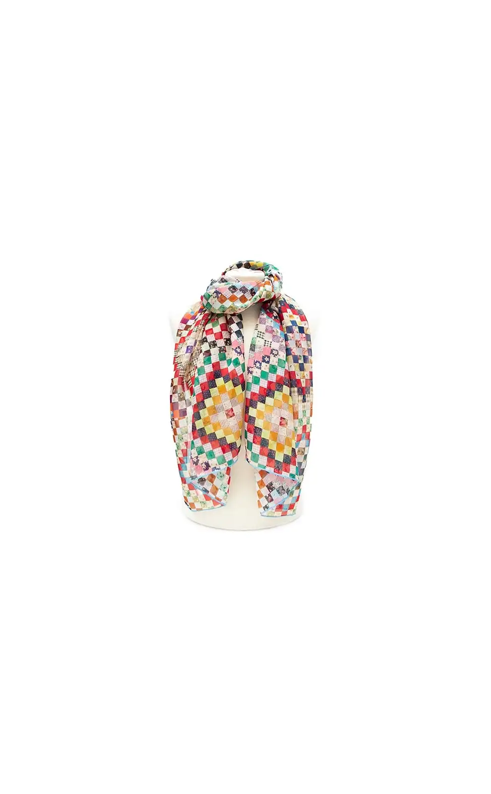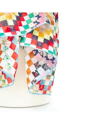 DESIGNER'S NOTES A colourful Fox & Chave silk chiffon scarf in the multiple colours and traditional pattern of North American quilts. Quilting in America developed as both necessity and artistic expression, with women stitching together worn fabrics to create warmth in draft prone homes. The word itself derives from the Old French cuilte the Latin culcita , meaning a stuffed sack or mattress. Early settlers brought quilting techniques from Europe, yet American quilts soon developed a distinct language of pattern, reflecting community, politics and personal memory. Patchwork designs such as Log Cabin mirrored the frontier spirit, while Underground Railroad motifs are thought to have carried coded messages. Contrary to the notion that only the poor quilted, affluent women often stitched elaborate coverlets from imported silks. Quilts were also treasured family records, passed down like manuscripts. COLOURS STYLING There are many ways to style a Fox & Chave chiffon silk scarf including the basic drape, belted drape and reverse drape. Our chiffon silk scarfs look really good worn in the bandit knot or faux infinity style too. More scarf styling ideas are available in this wonderful How to Tie a Scarf book. Length: 180 cm Width: 52 cm Dry clean only 100% Silk Chiffon Hand Rolled Hems