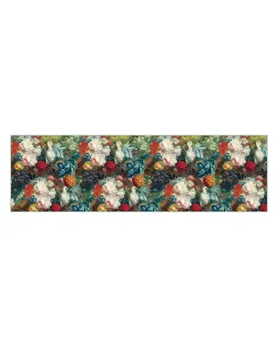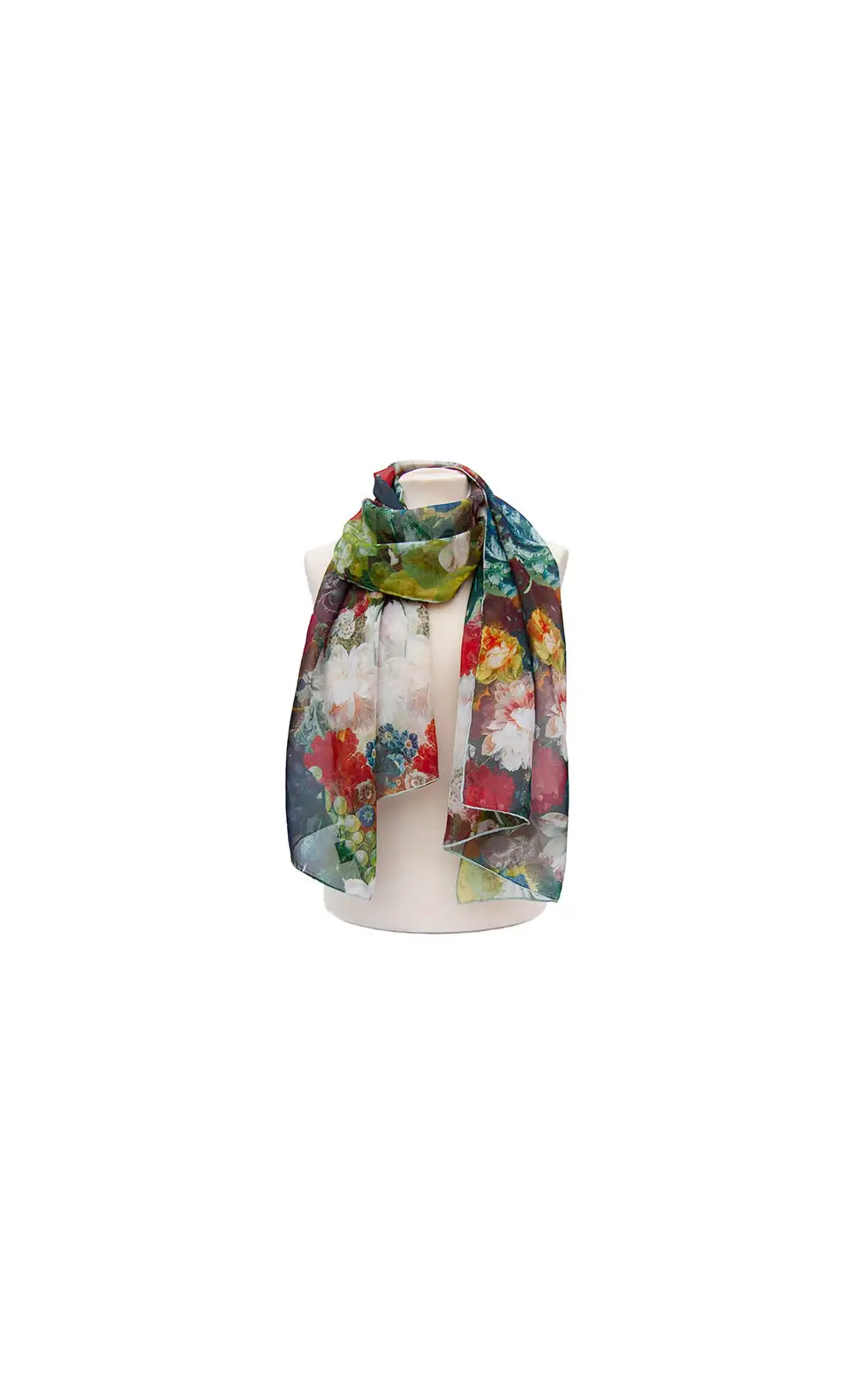 DESIGNER'S NOTES A floral Fox & Chave silk chiffon scarf with a design derived from the oil painting Still Life with Fruit and Flowers painted in the mid 18th century by the Dutch painter Jan Van Os the Younger (1744-1808) Jan van Os was celebrated for his elaborate still life works, and Still Life with Fruit and Flowers shows his mastery of a genre that had waned since the Dutch Golden Age. Trained first as a seascape painter, van Os turned to flower pieces after marrying into a family of artists, adapting the earlier tradition of Jan Davidsz de Heem and Rachel Ruysch but heightening the sense of theatrical display. His compositions often overflow with roses, tulips, and peonies, mingled with grapes, peaches, and figs, all rendered with luminous clarity. Insects sometimes creep among the petals and fruit, signalling decay. Many of his works were engraved and widely circulated, influencing decorative arts across Europe. COLOURS STYLING There are many ways to style a Fox & Chave chiffon silk scarf including the basic drape, belted drape and reverse drape. Our chiffon silk scarfs look really good worn in the bandit knot or faux infinity style too. More scarf styling ideas are available in this wonderful How to Tie a Scarf book. Length: 180 cm Width: 52 cm Dry clean only 100% Silk Chiffon Hand Rolled Hems