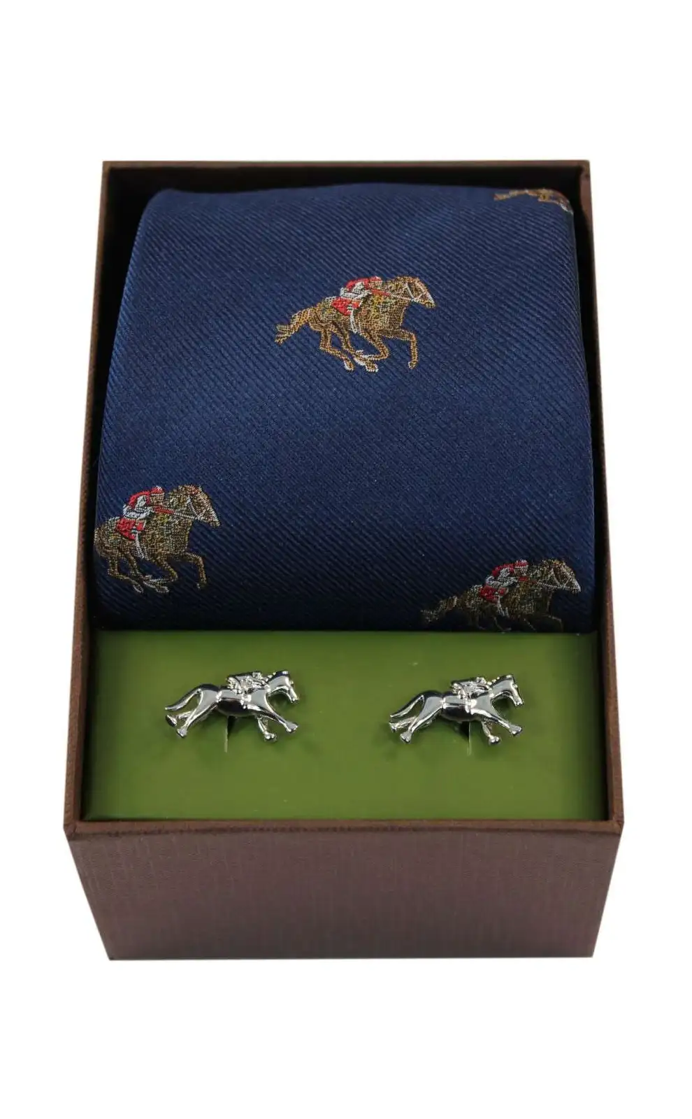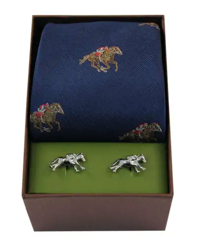 Navy Horse Racing Silk Tie And Cufflink Gift Box Set