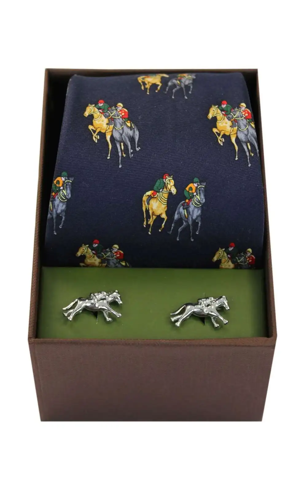 - Navy Horse Racing Theme Tie And Cufflink Set In A lovely Gift Box With Lid