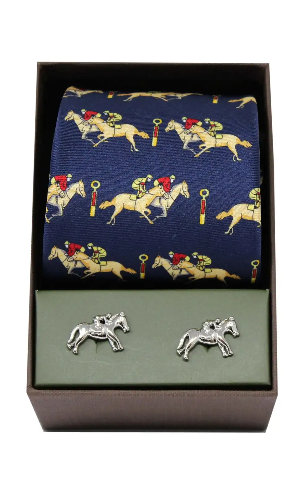 Soprano Navy Horse Racing Silk Tie and Cufflink Gift Box Set