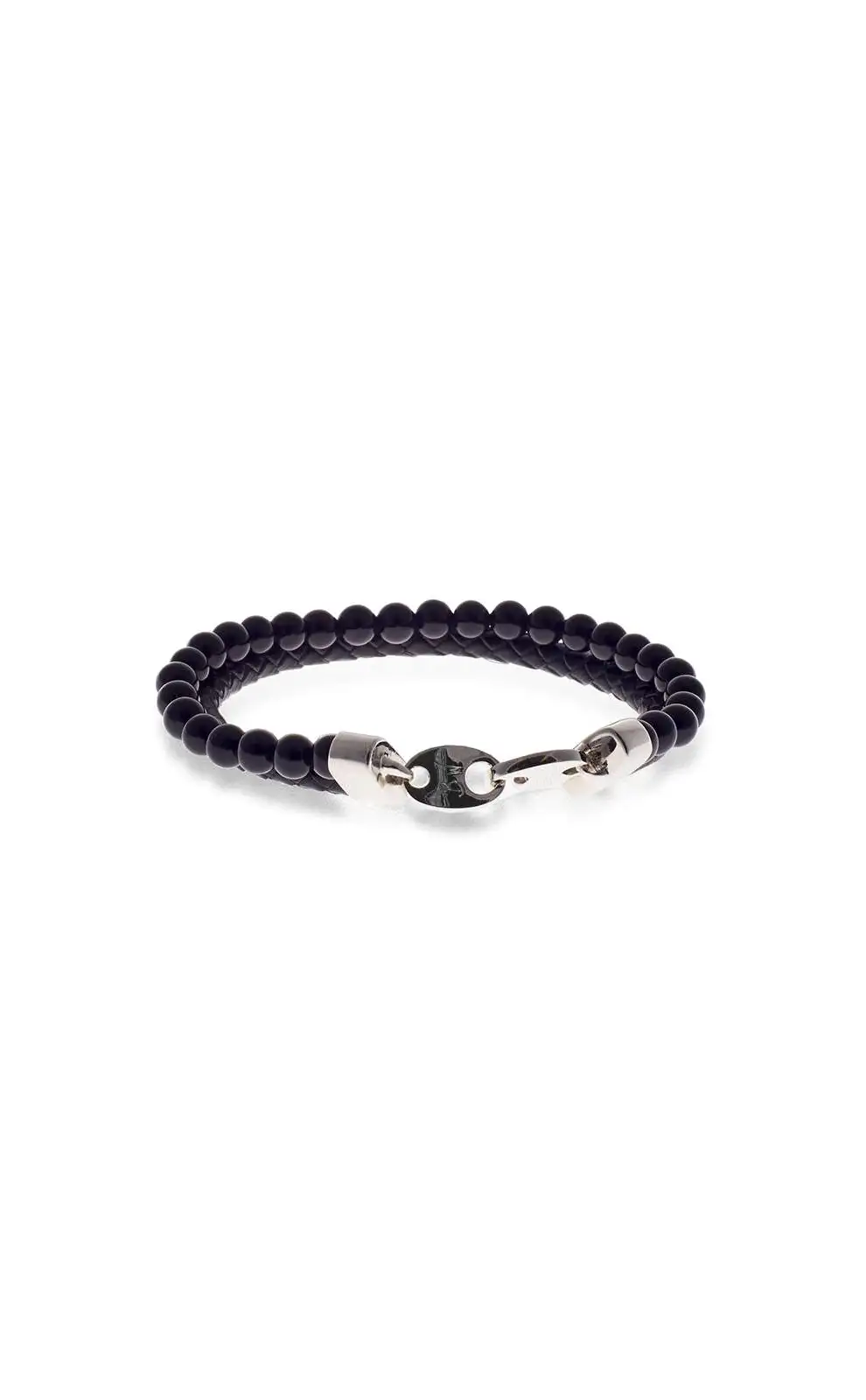 Two bracelets into one. One strap of the bracelet is made with Onyx semi-precious stone beads, the other from leather. Fixed with an elegant clasp plated in precious metal.
