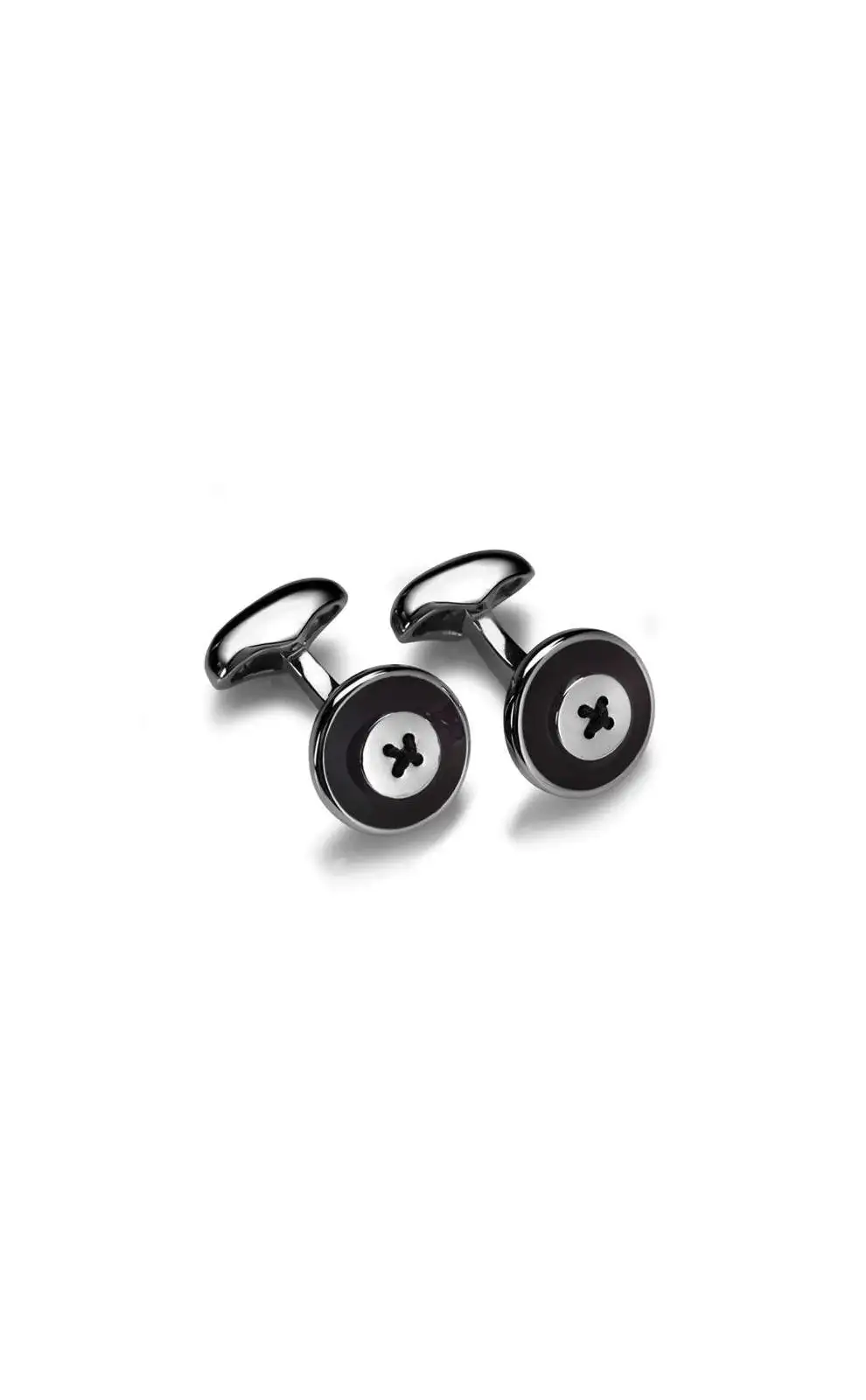 Hand enamelled Black Button cufflinks which have real black cotton thread sewn in the centre for an authentic and fun look.