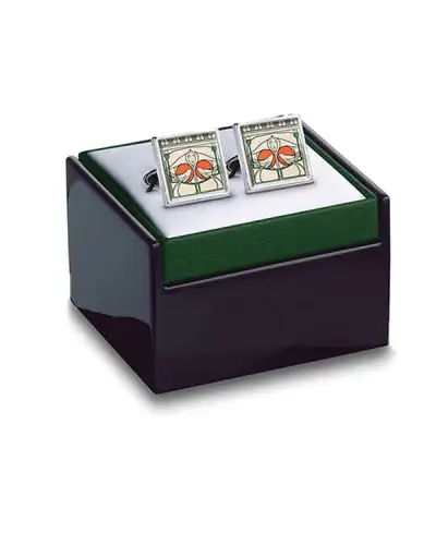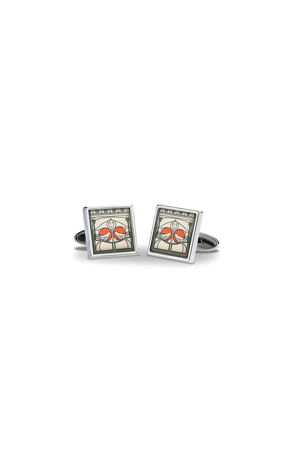 Straight-legged rhodium plated findings with a fixed oval back Cufflink Face Dimensions: 17mm x 17mm Presented in a flip top box Made in Britain This design is derived from a poster by Charles Rennie Mackintosh's for the Scottish Musical Review circa. 1896. Length: 17 mm Width: 17 mm Wipe Clean Rhodium Plate High Polish Shine