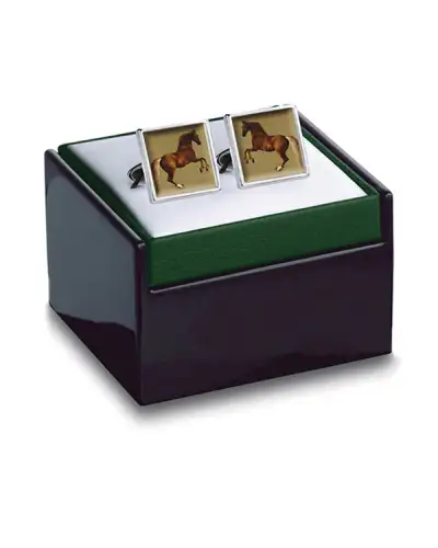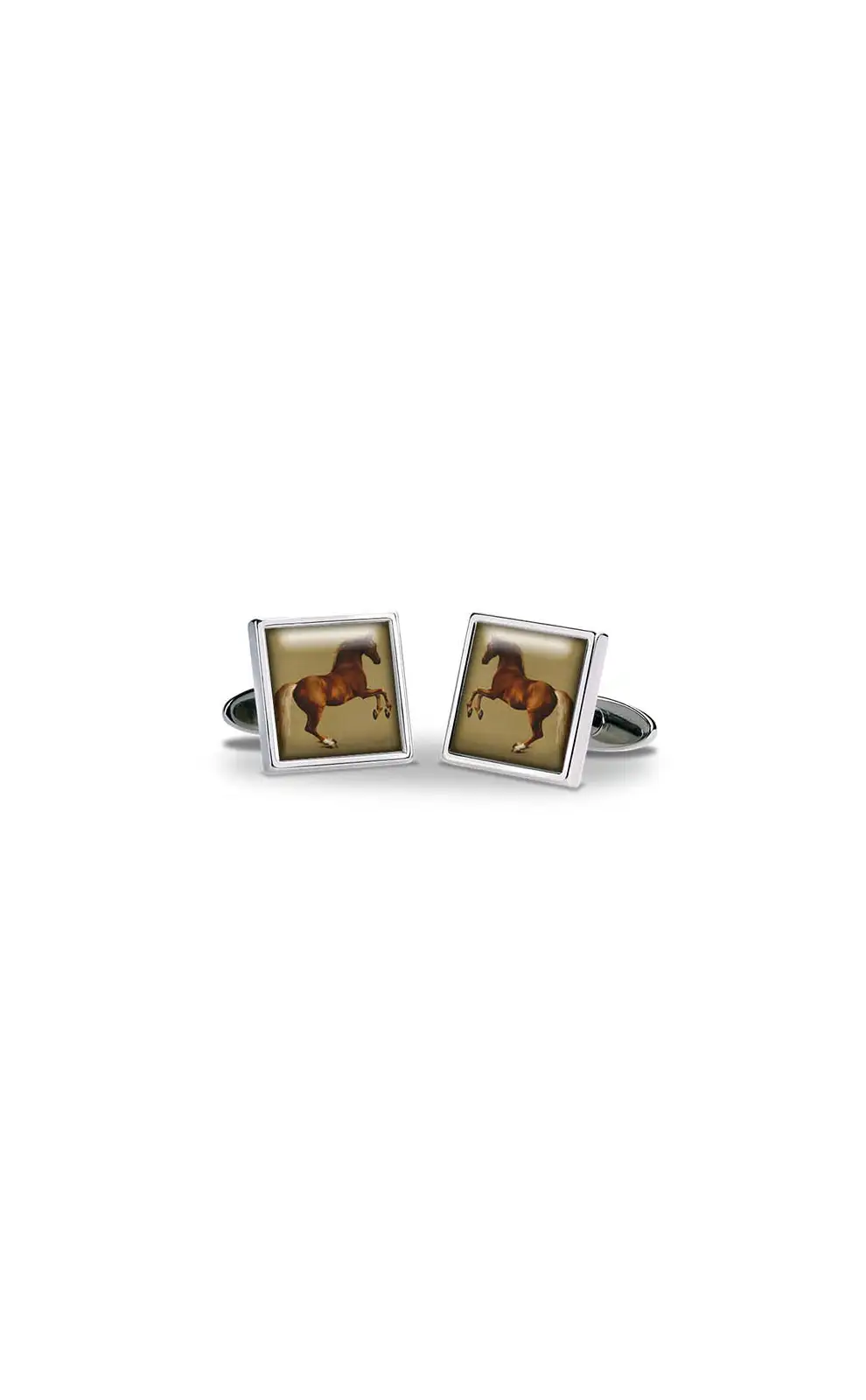 Straight-legged rhodium plated findings with a fixed oval back Cufflink Face Dimensions: 17mm x 17mm Presented in a flip top box Made in Britain Whistlejacket is an oil painting by George Stubbs, a British artist. It shows the Marquess of Rockingham's racehorse at around life size. Length: 17 mm Width: 17 mm Wipe Clean Rhodium Plate High Polish Shine