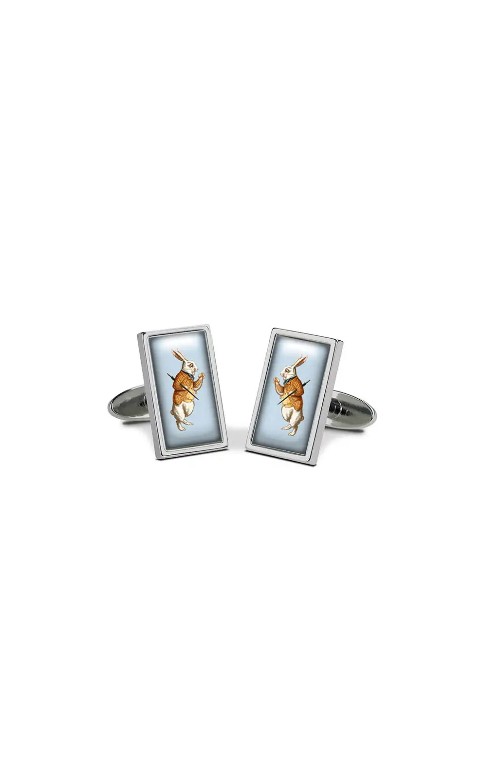 Straight-legged rhodium plated findings with a hinged back Cufflink Face Dimensions: 10mm x 20mm Presented in a flip top box Made in Britain This White Rabbit design is based on illustrations by John Tenniel of the Lewis Carroll character. Length: 17 mm Width: 17 mm Wipe Clean Rhodium Plate High Polish Shine