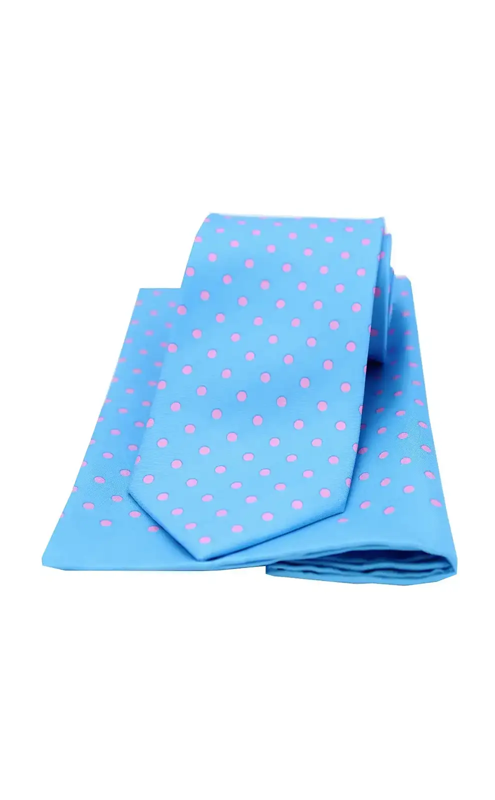 Soprano Blue And Pink Polka Dot Matching Silk Tie And Pocket Square