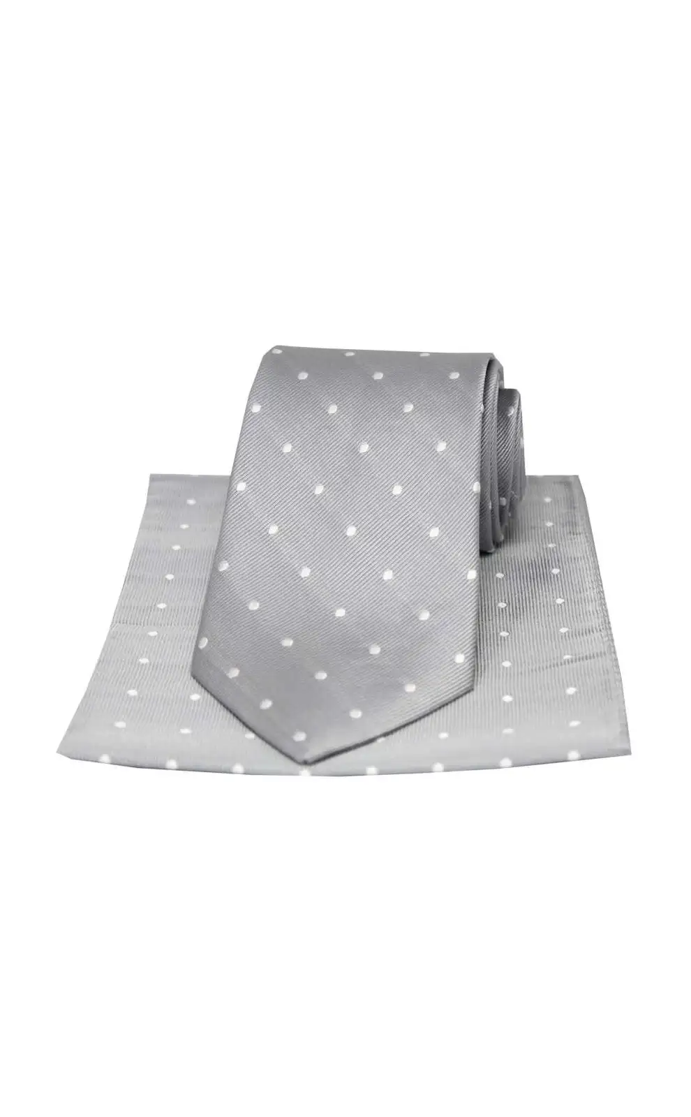 - Soprano Silver With White Polka Dots Silk Tie And Pocket Square