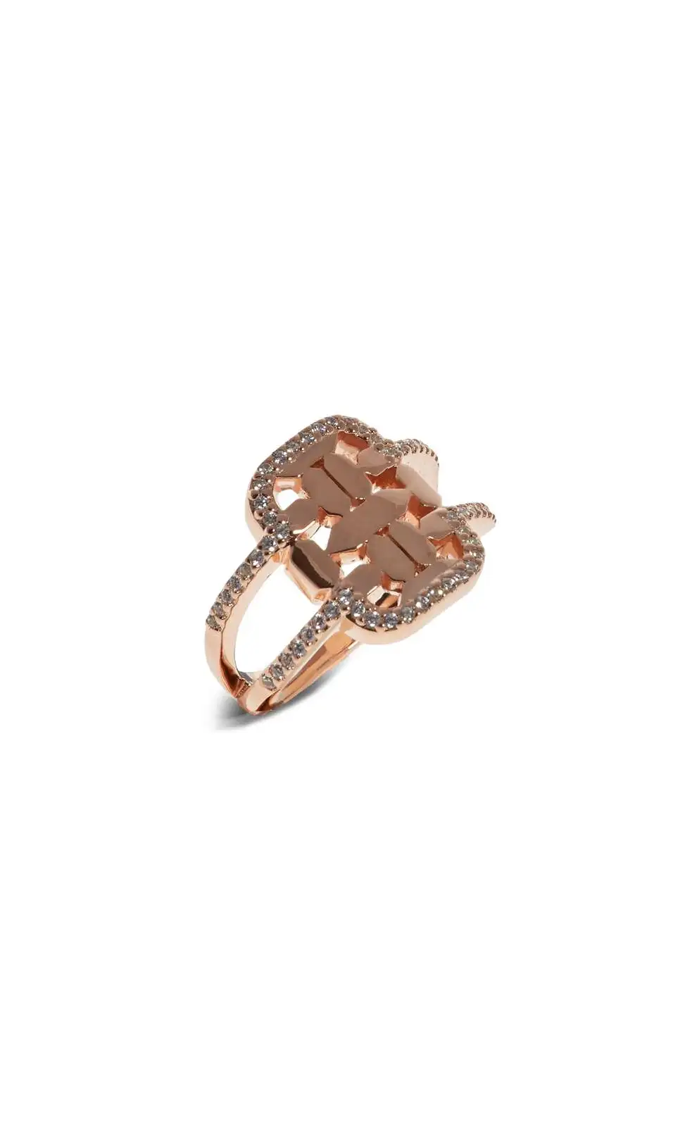 This geometric design blends contemporary style with a sparkling elegance. Inspired by Babette's travels to Turkey, this ring is set with a contour of micro pave Cubic Zirconias. Made from Sterling silver and plated with 18 carat rose gold.