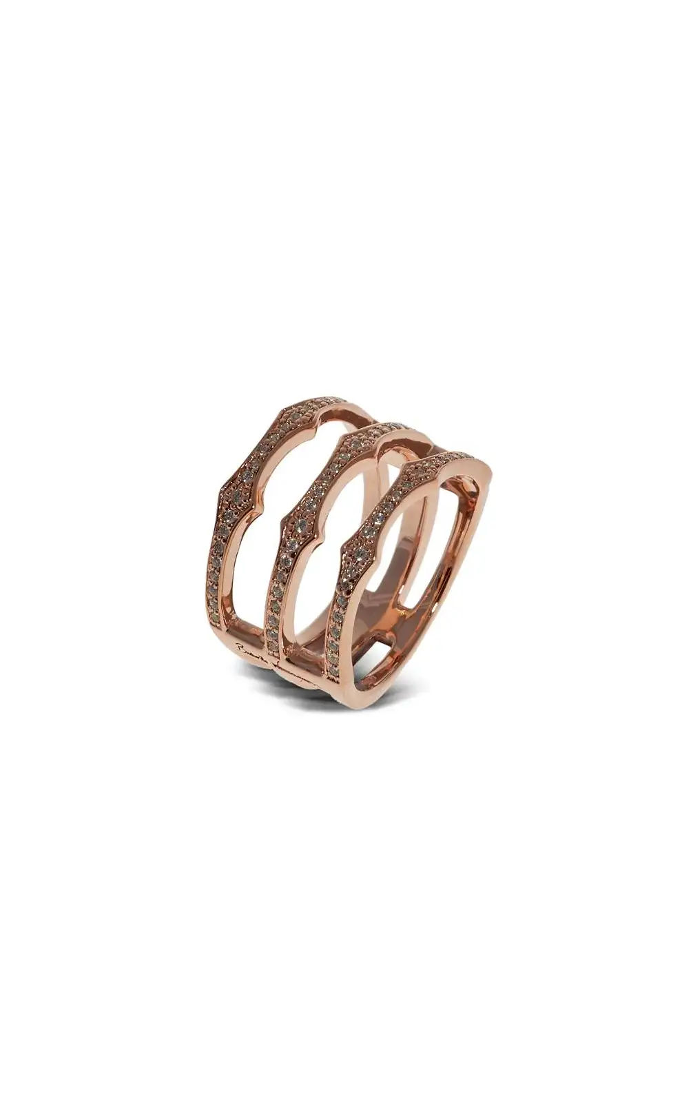 With a mix of gothic detailing and ultra elegant swag, this ring is totally on-trend. Made from Sterling Silver and encrusted with three rows of micro pave Cubic Zirconia stones this is a great ring for everyday or evening wear. Made from Sterling silver and plated with 18 carat rose gold.