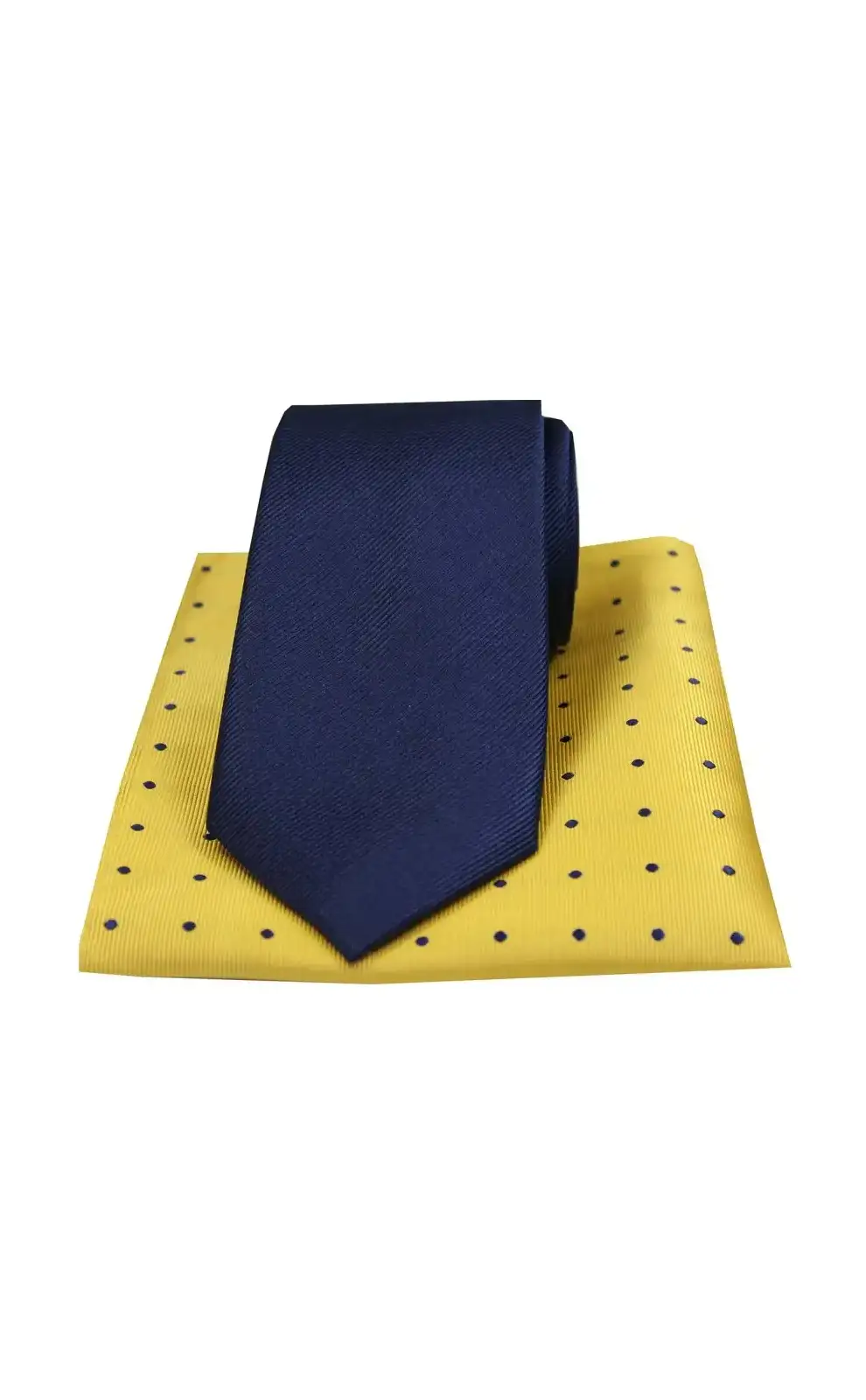 Soprano Plain Navy Silk Tie With Gold Polka Dot Silk Hanky
