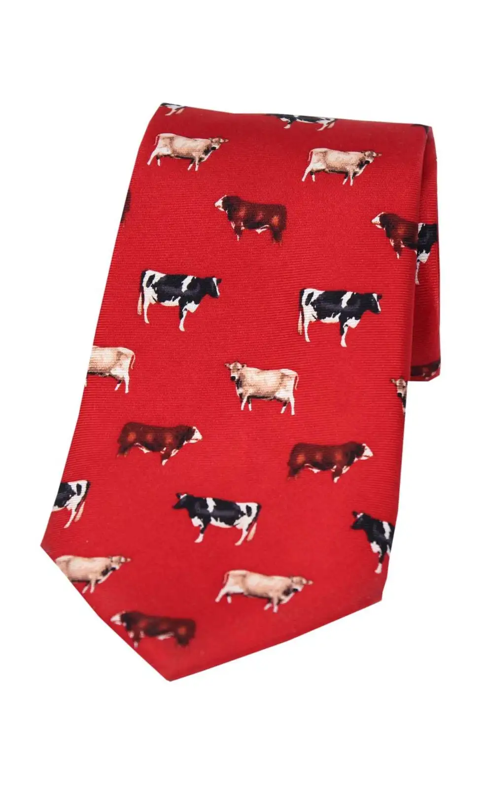 - Soprano Cow Breeds On Red Ground Country Silk Tie, The Perfect Addition To Any Discerning Gentlemen's Country Wardrobe.