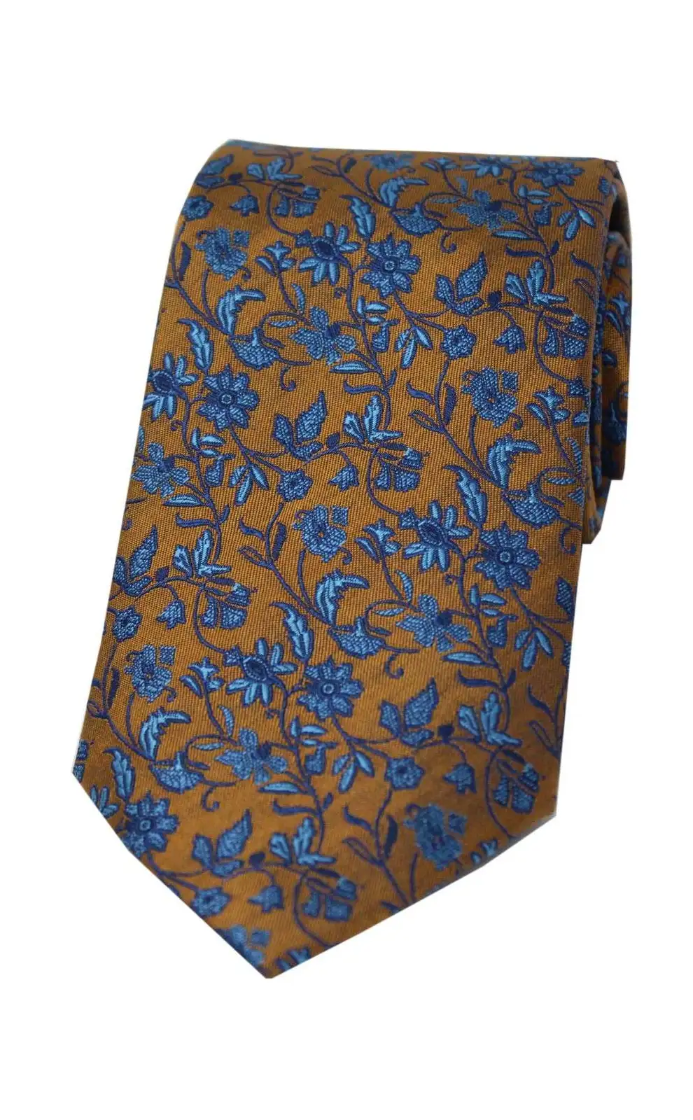 - Soprano Dark Gold With Small Blue Flowers Silk Tie, Finest Quality Silk Men's Ties.