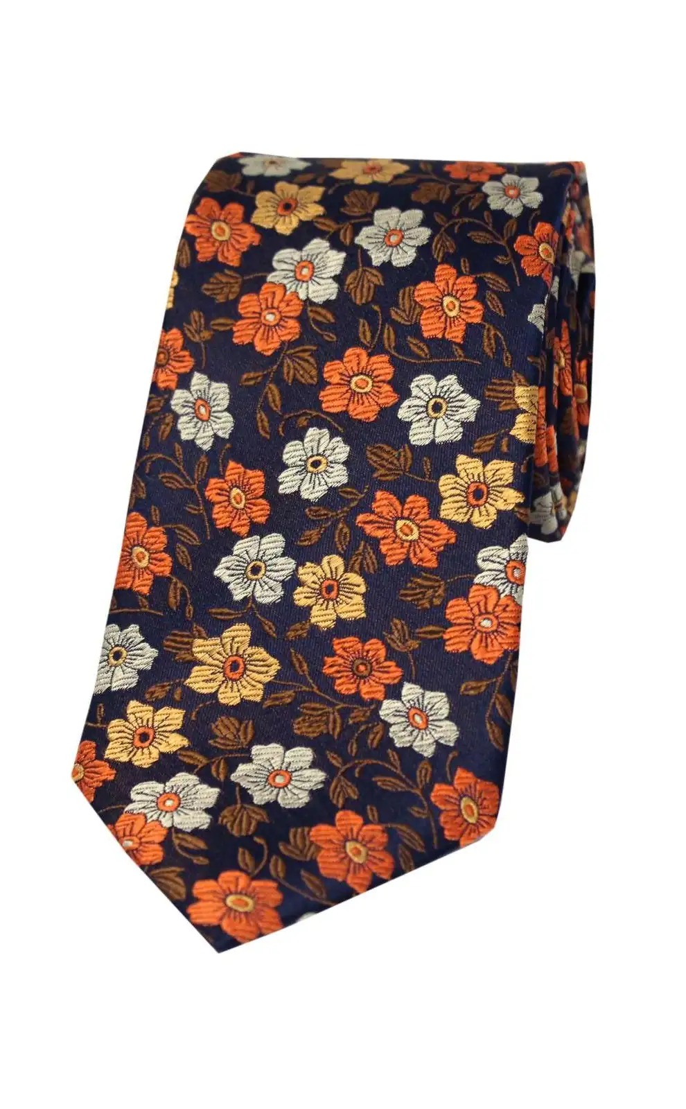 Soprano Dark Navy Ground With Orange Bronze Ivory Flowers And Brown Leaves Pattern Silk Tie