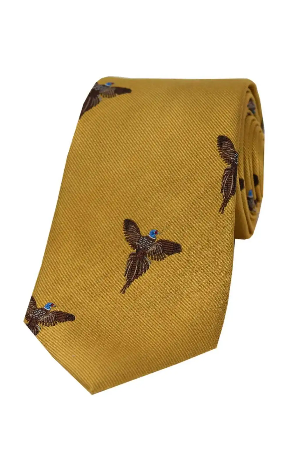 - Soprano Flying Pheasant On Gold Ground Country Silk Tie, the perfect addition to any discerning Gentlemen's Country wardrobe.