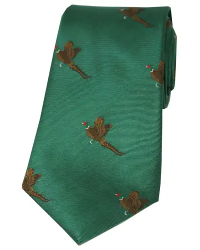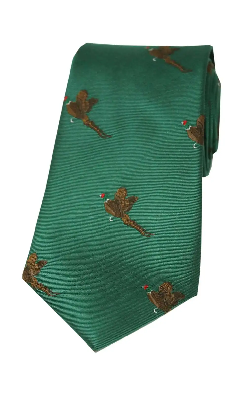 - Soprano Flying Pheasants On Green Ground Country Silk Tie, the perfect addition to any discerning Gentlemen's Country wardrobe.