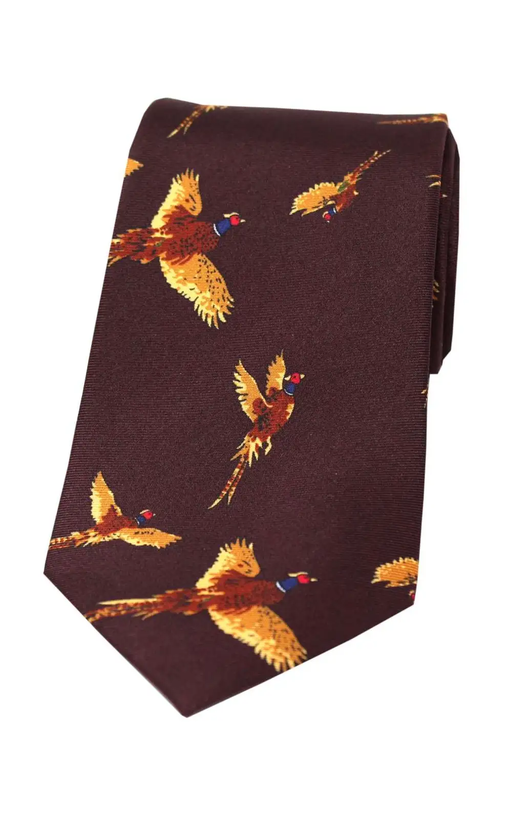 - Soprano Flying Pheasants Wine Ground Country Silk Tie, the perfect addition to any discerning Gentlemen's Country wardrobe.