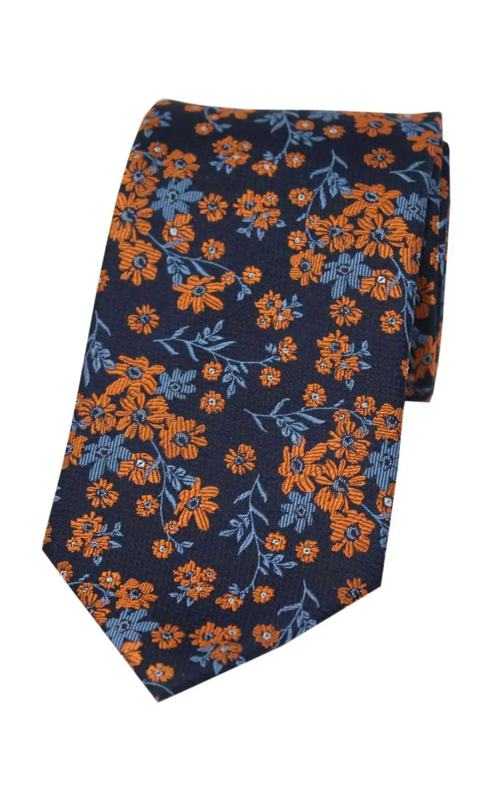 - Soprano Navy Ground Blue And Burnt Orange Flowers Silk Tie