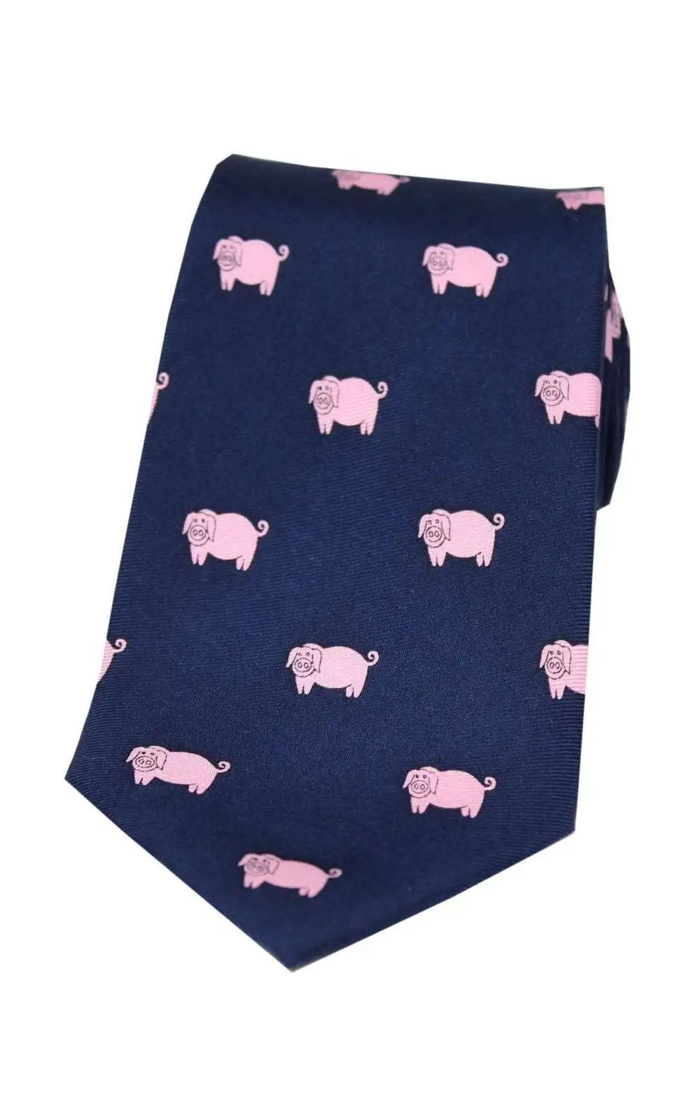 - Soprano Pink Pigs On Navy Blue Ground Country Silk Tie, the perfect addition to any discerning Gentlemen's Country wardrobe.