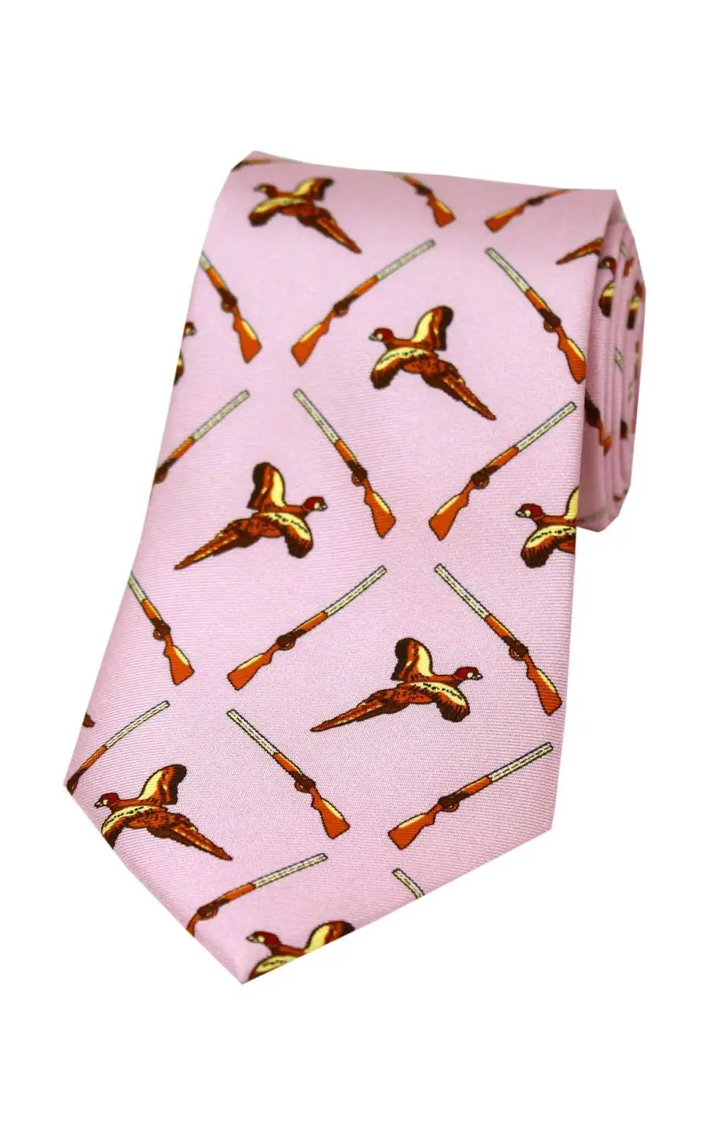 - Soprano Pink Printed Silk Flying Pheasant with Shotguns Country Silk Tie, A lovely accessory for any discerning Gentlemen's Country wardrobe.
