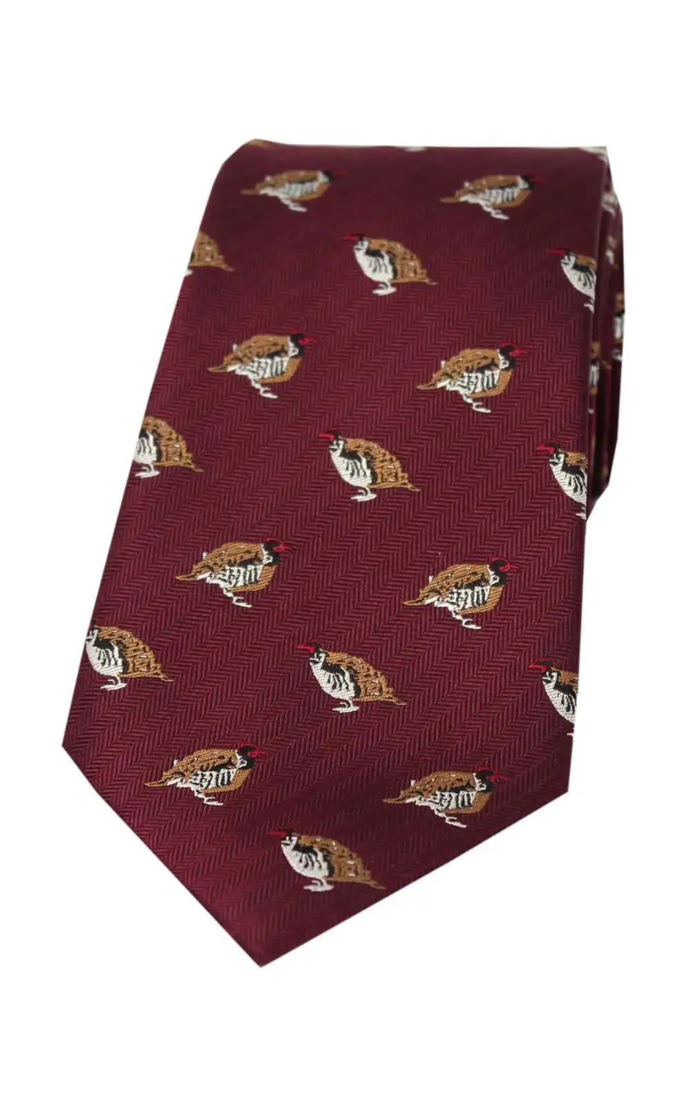 - Soprano Red Legged Partridge on Wine Ground Country Silk Tie, the perfect addition to any discerning Gentlemen's Country wardrobe.