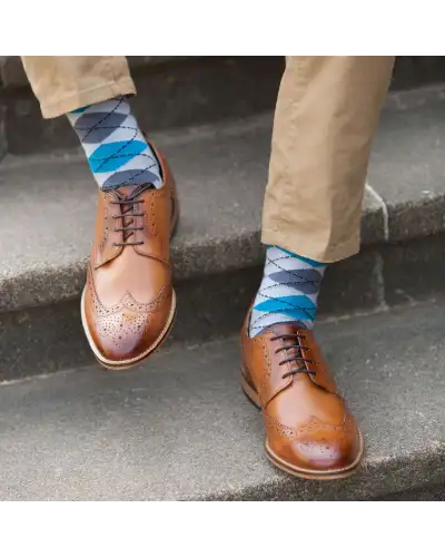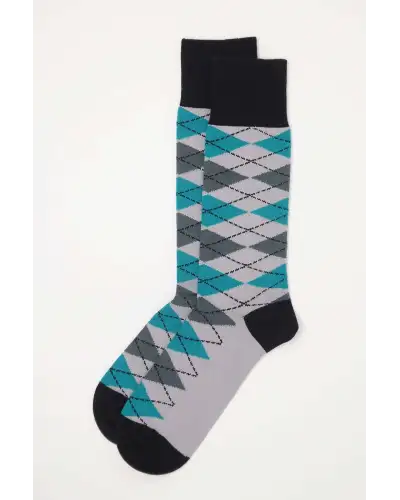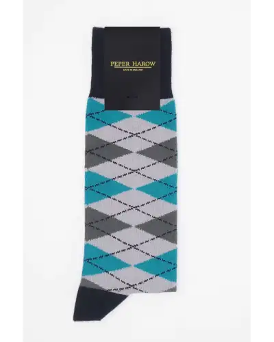 Adding an eccentric, colourful and modern twist to a timeless design, the classic Argyle men's luxury socks in grey and blue with a black heel, cuff and toe - for the gentlemen who like their quintessential style with a splash of quirky colour.