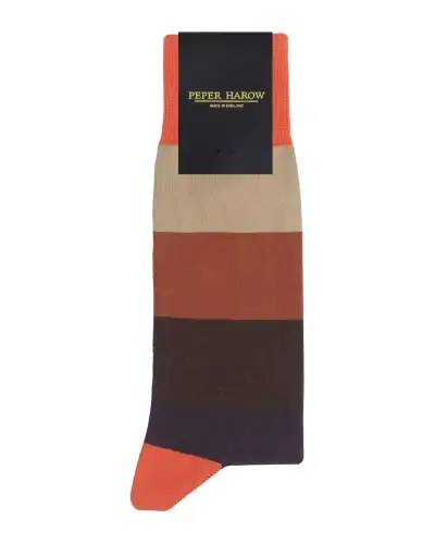 Whether you're looking to explore a new style or just want a pair of bold statement socks, the autumn Block Stripe men's luxury socks are ideal. These men's socks feature bold stripes in warm hues of autumn and are a brilliant addition to the wardrobes of stylish gentlemen who prefer a unique outfit.