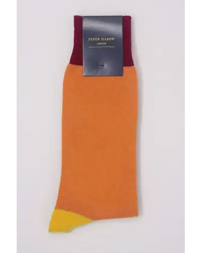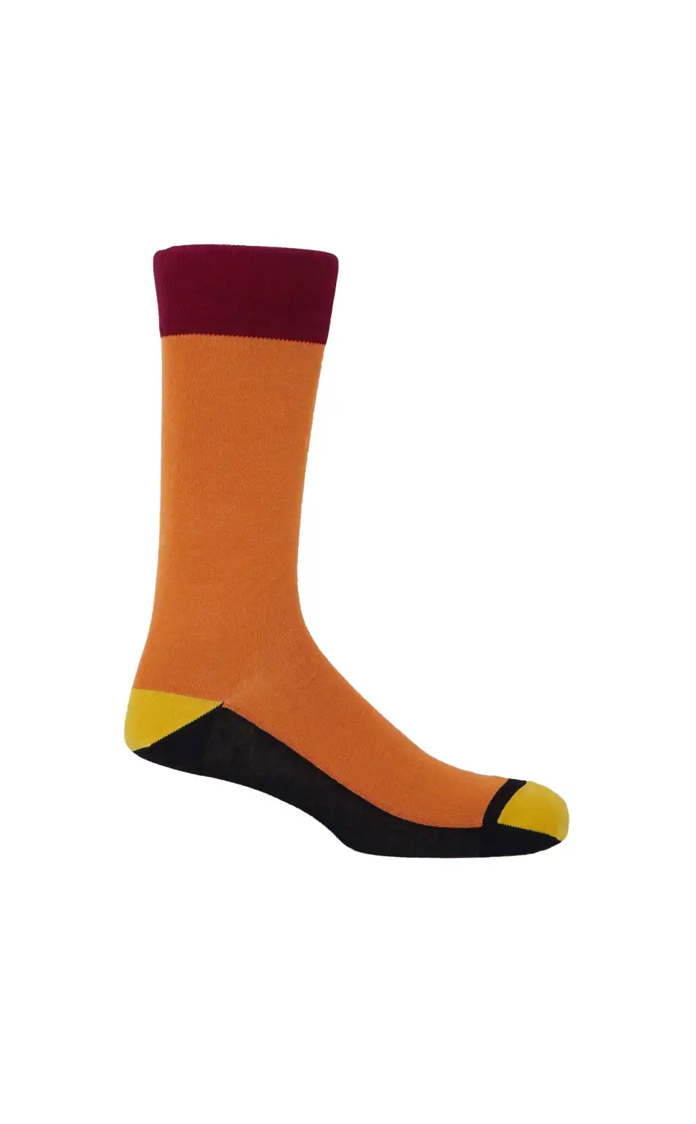 Introducing the orange Burgess stylish Egyptian cotton men's socks. With a contrasting yellow heel and burgundy cuff, these extraordinary gentleman's luxury socks are a perfect fit for the dapper man who wants style and impeccable quality without compromise.