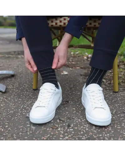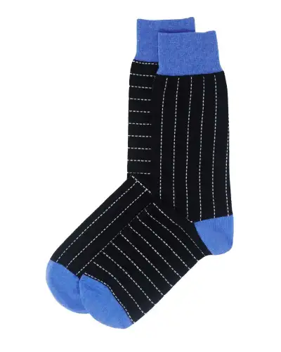 The black Dash men's socks feature a unique pattern that is sure to catch the eye and are a true fashion statement for gentlemen. Featuring a vertical and horizontal dash pattern on one sock and the opposite on the other, these men's black socks are perfect for any occasion, whether you're dressing up for a formal event or want to add a touch of unique style to your everyday look.