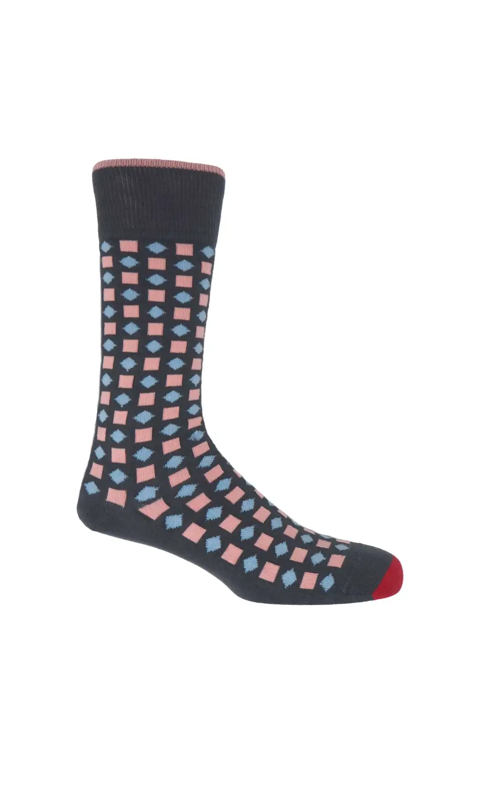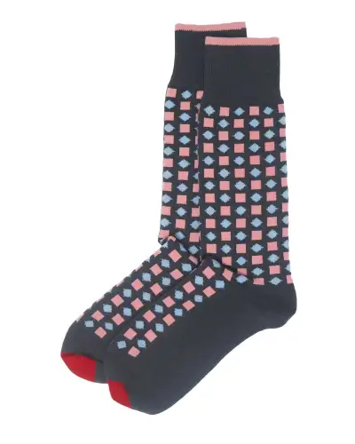 The ever-stylish grey Diamonds men's luxury socks transforms an already dashing outfit into a statement that only true gentlemen can achieve. Featuring pink squares and blue diamonds, these dark grey socks for men are a spectacular addition to any attire.