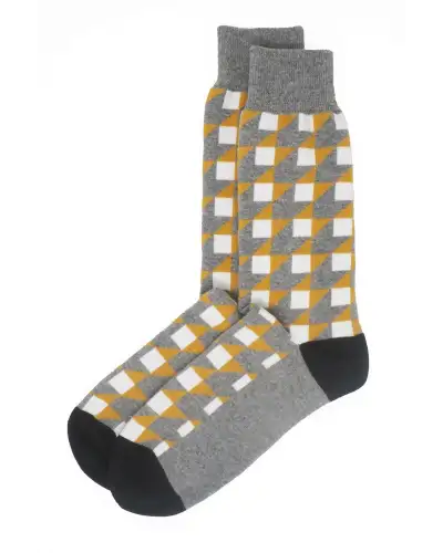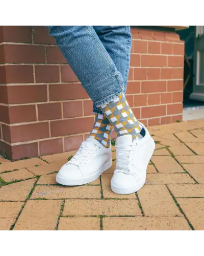Introducing the grey Dimensional men's luxury socks - the eco-friendly patterned socks that make a statement! Crafted with care from premium recycled cotton, these grey, white, and mustard socks are both stylish and sustainable.