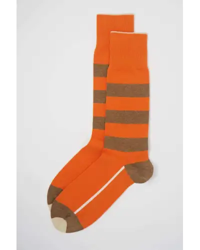 A classic style turned sustainable. Introducing the sumptuous Equilibrium men's luxury orange socks, featuring three textured light brown stripes on a warm orange with a stylish white line along the foot, these GOTS certified organic socks are a must-have for the environmentally-conscious fashion connoisseur!