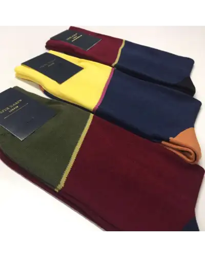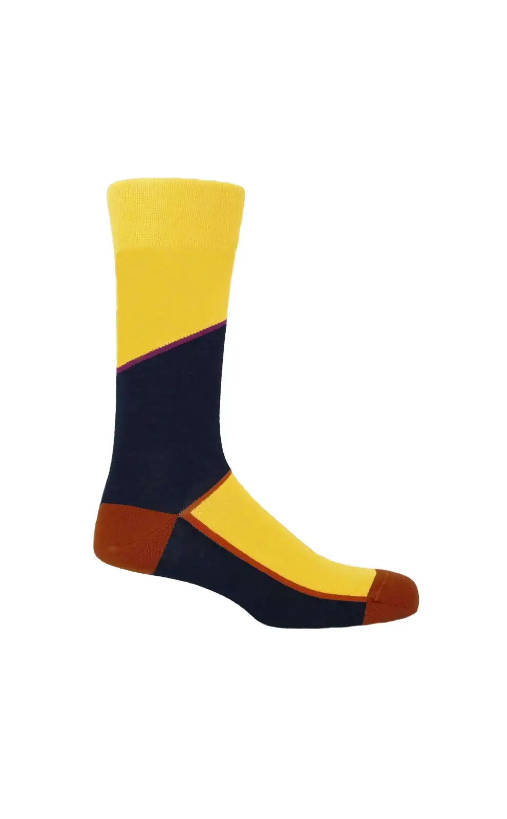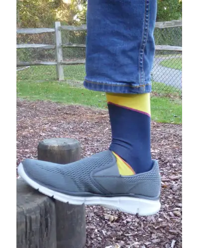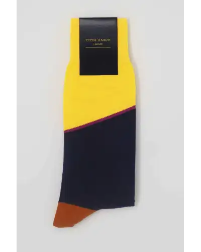 Introducing the powerful bumblebee Hilltop men's luxury socks. These rich, colourful, socks are the perfect enhancement to the truly dapper gentleman's wardrobe. With a magenta stripe separating the vibrant yellow with the cool navy, and a contrasting orange heel and toe, this luxurious design is for the man on his way to the top.