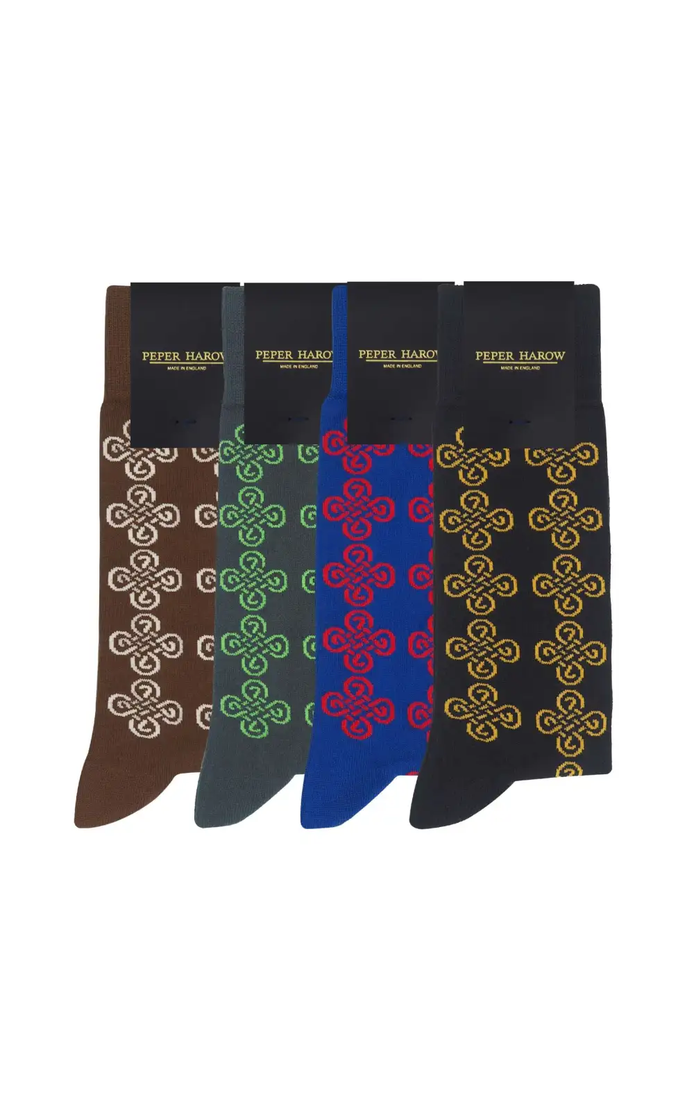 The Heritage men's Knot bundle brings together the contemporary Knot design in four stylish colours including green, brown, blue, and black. Featuring a unique Celtic knot pattern in complementary hues. These luxury men's socks balance sophistication and versatility, making them ideal for formal occasions or improving your everyday look. A true blend of heritage and modern fashion, they're a must-have for any wardrobe.