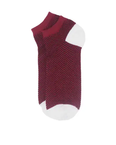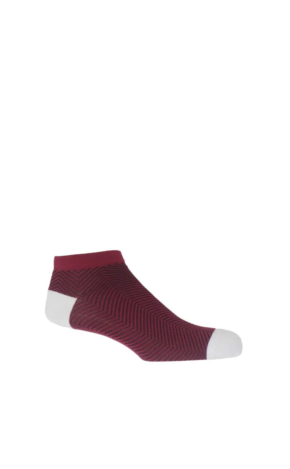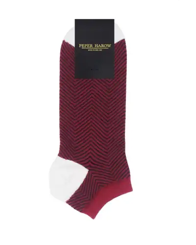 Experience sophisticated style during summer with the Lux Taylor men's trainer socks - a longstanding favorite and best-seller from Peper Harow. These impeccably designed socks are now available in burgundy, adorned with a sleek black zigzag pattern and white heel and toe.